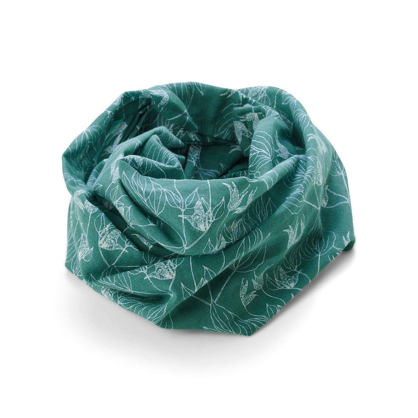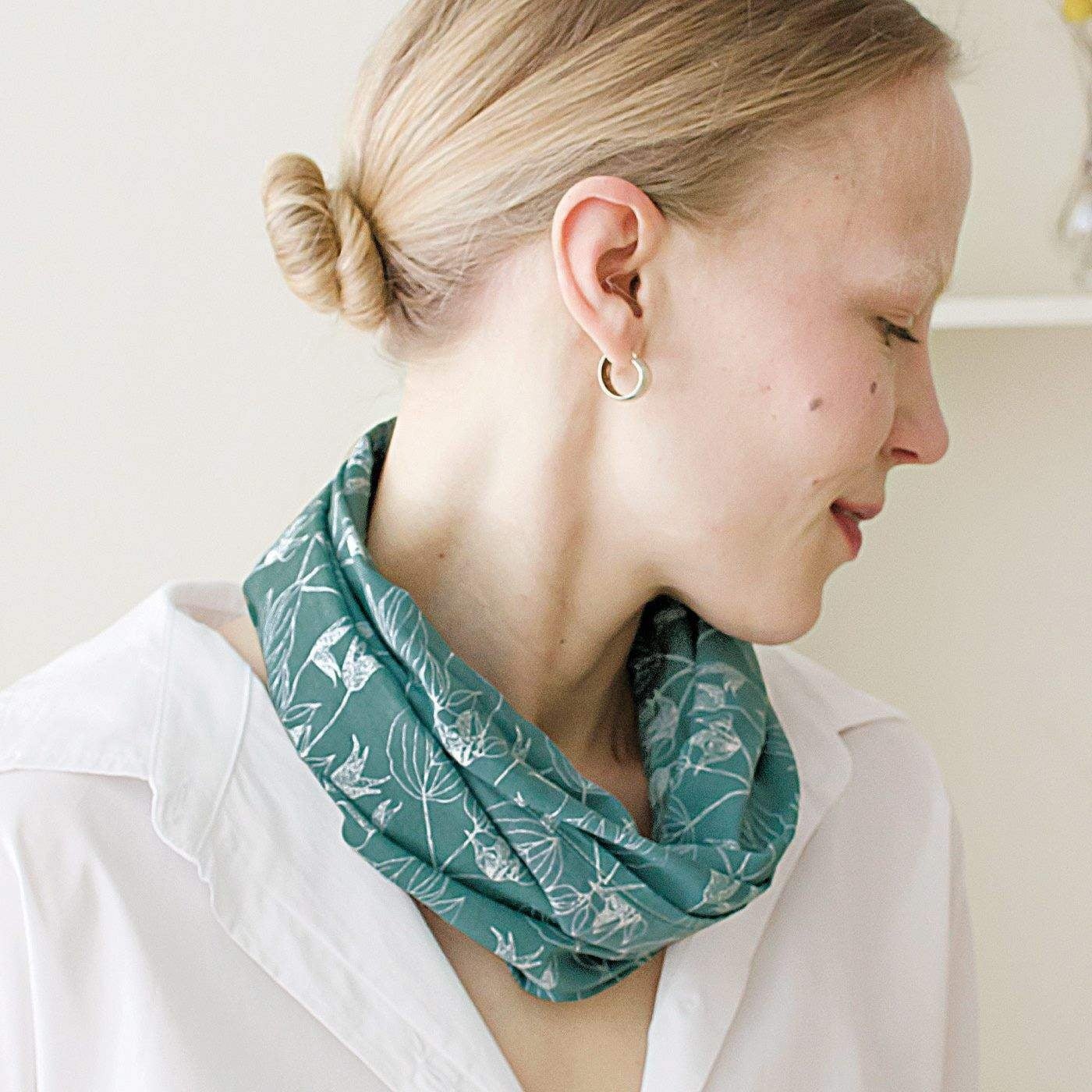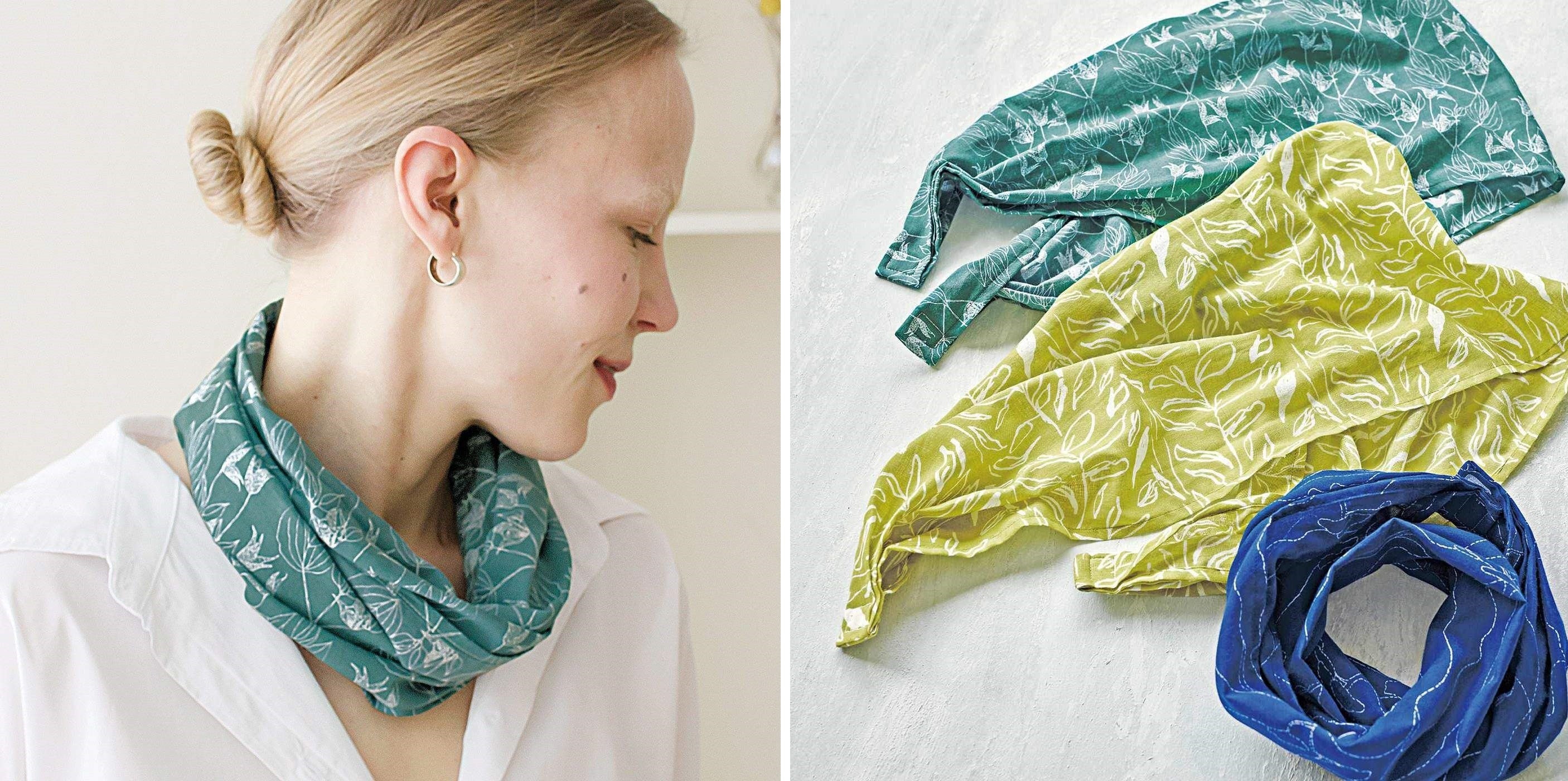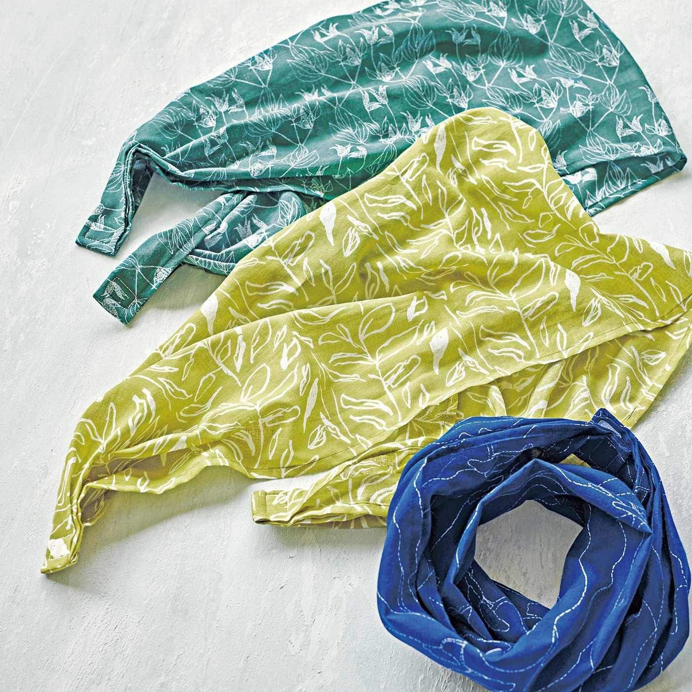 アートなパターンと適度なボリューム感が特徴で、くるりと巻き付けて両端の面ファスナーで留めるだけのテクニックいらずなスカーフです。メイクや髪型が崩れる心配無くさっと巻けて、ほどけたり風で飛ばされる心配もないのでストレスを感じません。軽やかで肌当たりがよいガーゼ生地は毎日洗って清潔に使うことができるから夏にうれしいアイテムです。