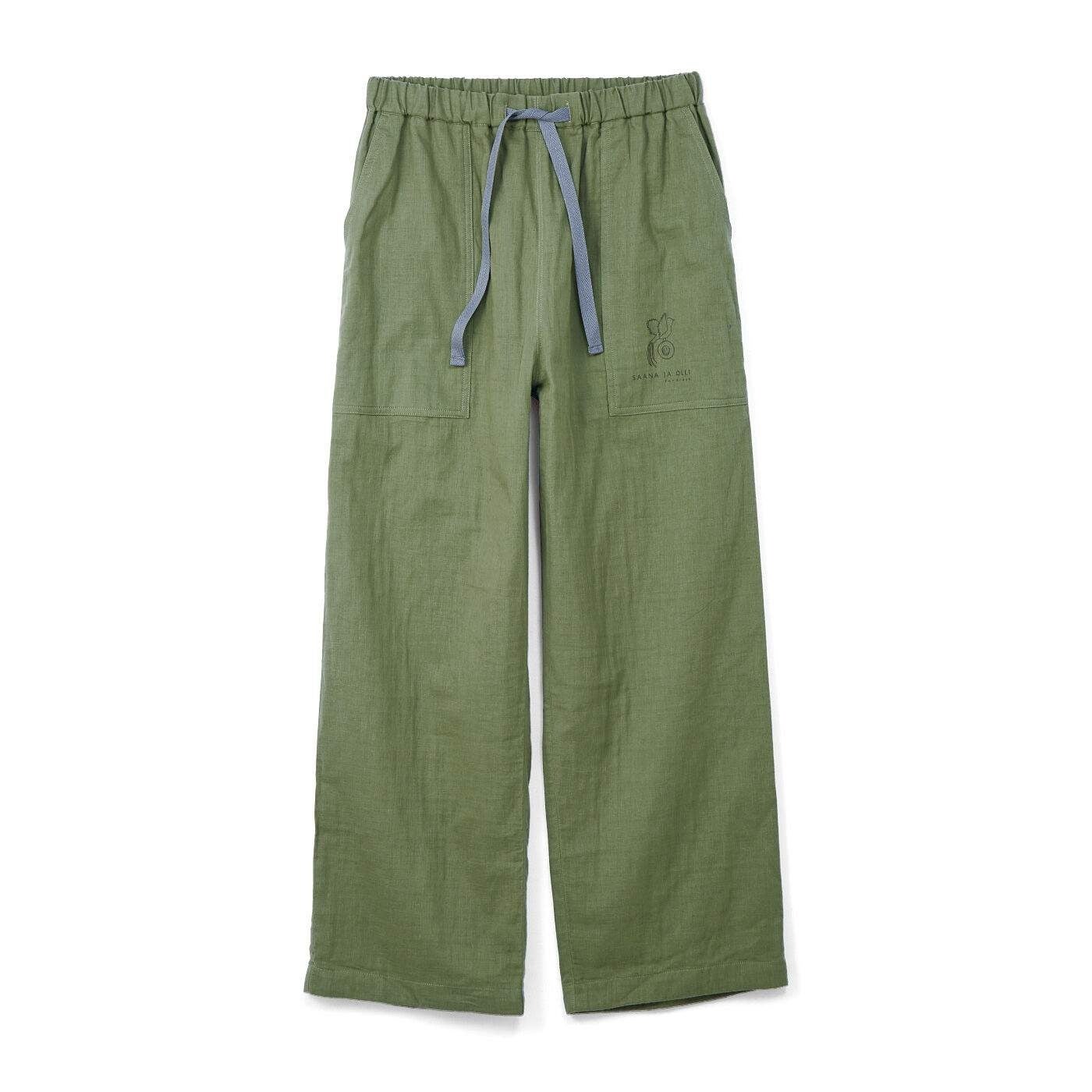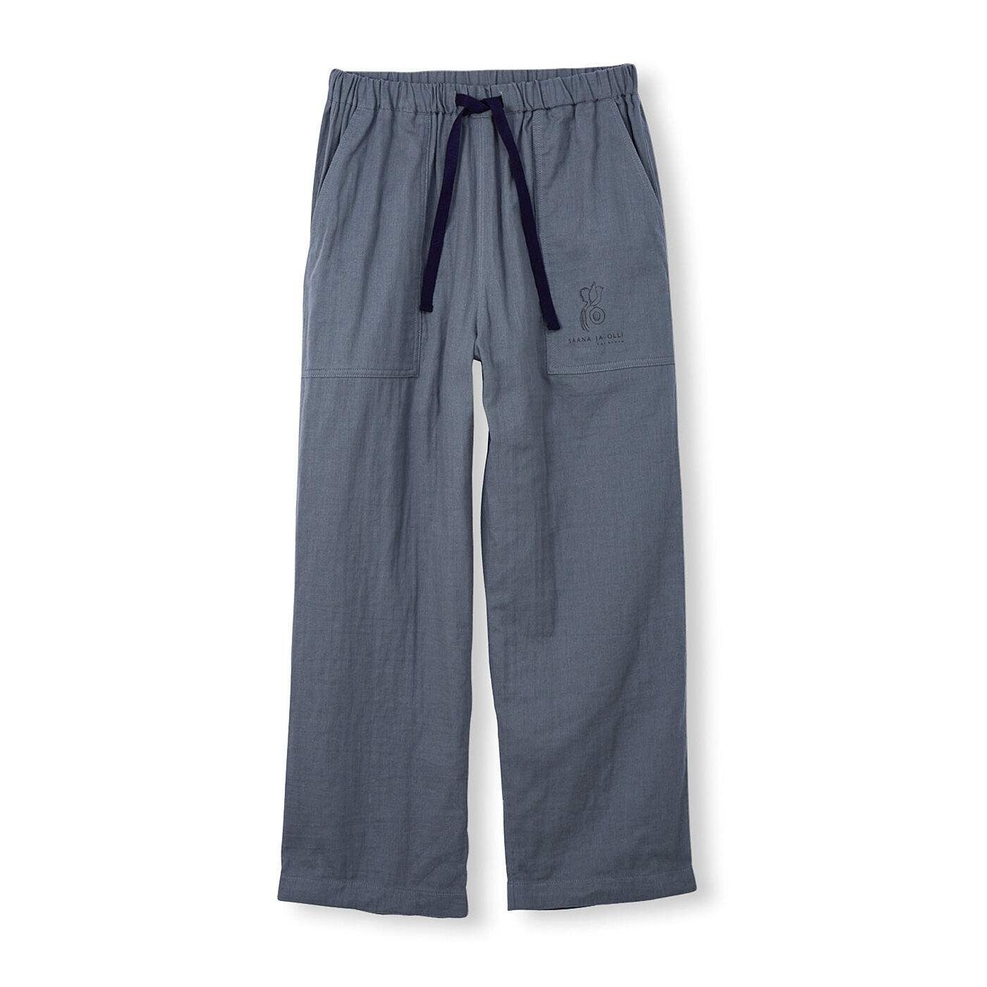 ダブルガーゼ素材が心地よく、自然体で過ごせるワイドシルエットのパンツです。ポケットの鳥のプリントや、すそに通したひもで変化するシルエットなど、独自のディテールが特徴です。上品さとカジュアル感のバランスがよく、夏のファッションで活躍します。
