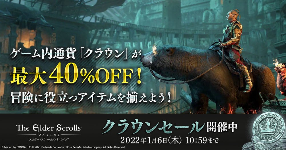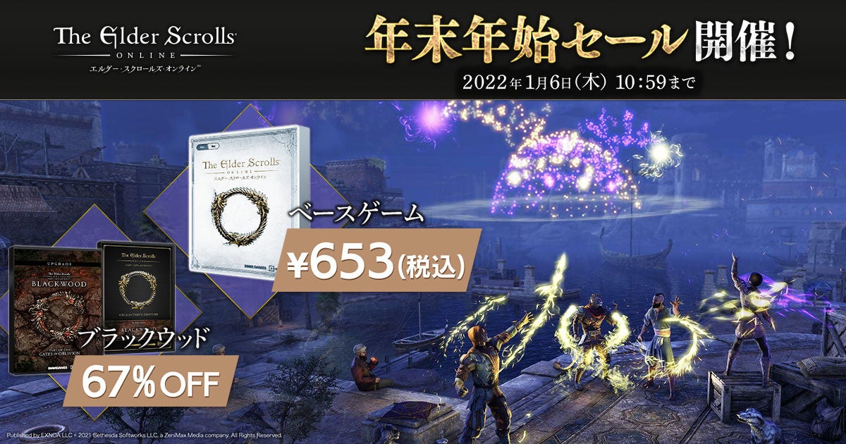 合同会社EXNOA(本社:東京都港区、CEO:村中 悠介、URL:https://games.dmm.com/)が運営するDMM GAMESは、全世界で1,900万人がプレイする本格MMORPG『エルダー・スクロールズ・オンライン』日本語版(WIN/MAC対応)にて、最新チャプター「ブラックウッド」や「ベースゲーム」がお得にお求めいただける他、ゲーム内で使える通貨「クラウン」を最大40%割引で購入できる『年末年始セール』を開催しております。