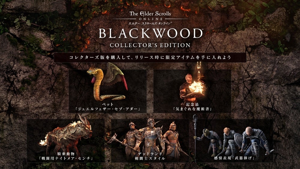 最新DLC「ブラックウッド」に加え、『ESO』のプレイに必須となる「ベースゲーム」や、今までのDLCである「モロウウィンド」「サマーセット」「エルスウェア」「グレイムーア」が含まれています。これからESOを始めたいと考えているプレイヤーにぴったりのセットです。