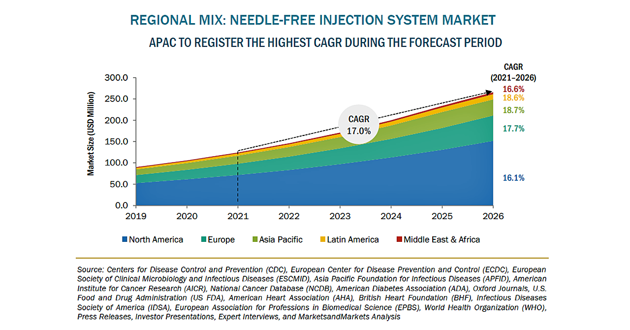 感染症や慢性疾患の蔓延が進むにつれ、ニードルフリーインジェクションシステムの需要と開発が増加しており、今後数年間は市場成長が促進されると考えられます。