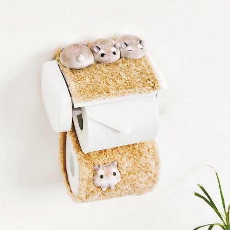 ハムスターたちがおがくずの上で寄り添う姿が愛らしいトイレットペーパーストッカーです。