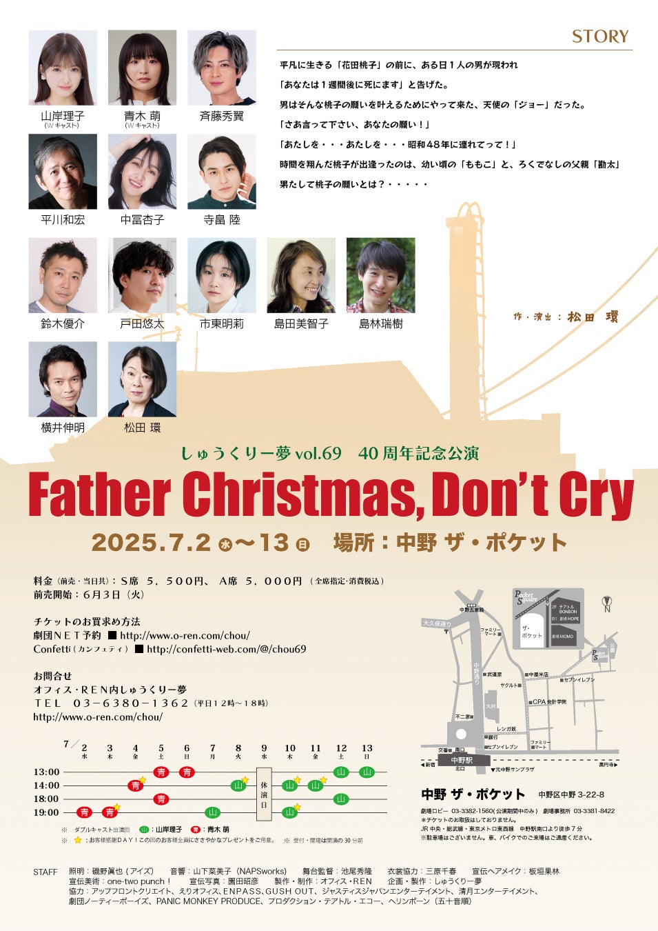 しゅうくりー夢 vol.69 40周年記念公演『Father Christmas, Don't cry』が2025年7月2日 (水) 〜 2025年7月13日 (日)に中野ザ・ポケット(東京都中野区中野3-22-8)にて上演されます。