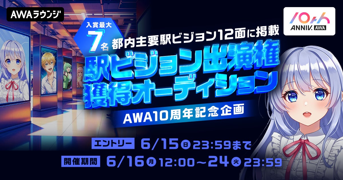 AWA株式会社(本社:東京都港区、代表取締役CEO:冨樫晃己)が運営する、サブスクリプション型(定額制)音楽ストリーミングサービス「AWA(アワ)」は、AWA10周年記念企画として、都内主要駅ビジョン12面に同時掲載されるチャンスを掴めるオーディションを開催いたします。