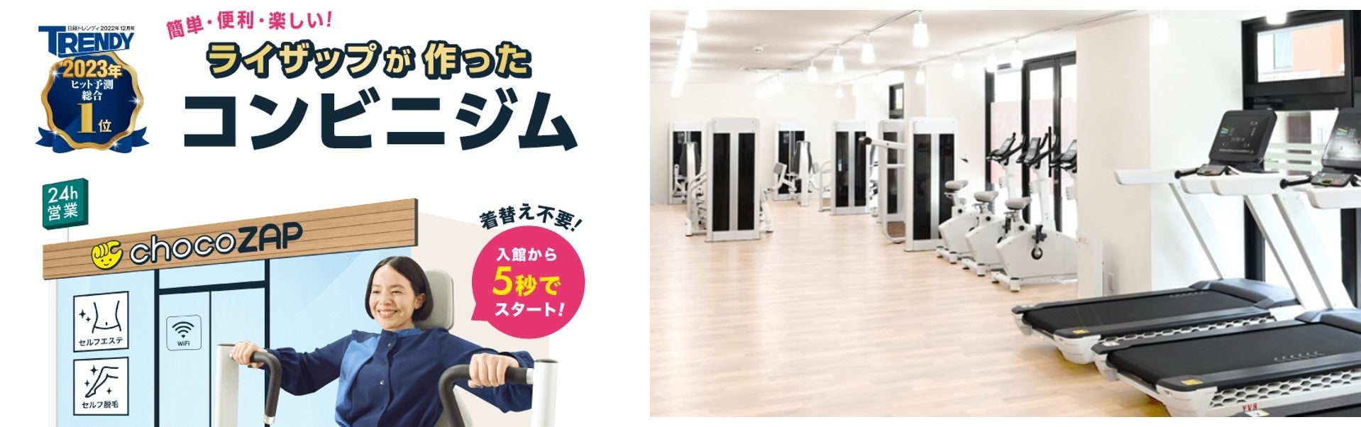 chocoZAP(ちょこざっぷ)は、誰もが運動を継続しやすく、効果を実感でき、1日5分の運動で健康になれる、「簡単」「便利」で「楽しい」、月額2,980円(税込3,278円)で利用できる、RIZAPがつくったコンビニジムです。