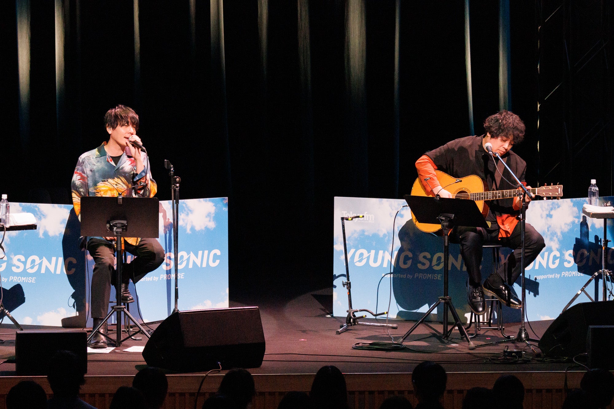 公開イベント第1部では、13時からflumpoolのVo.山村隆太と、Gt.阪井一生が、「みんなの自分らしい居場所」をコンセプトに、10代、20代の間で流行っていること、感性を刺激する音楽や情報からマジメな話まで、さまざまな話題を繰り広げる番組『YOUNG SONIC supported by PROMISE』(毎週土曜12:30-12:55放送)、通称「ヤンソニ」がスタジオを飛び出し、初めての公開収録を開催!