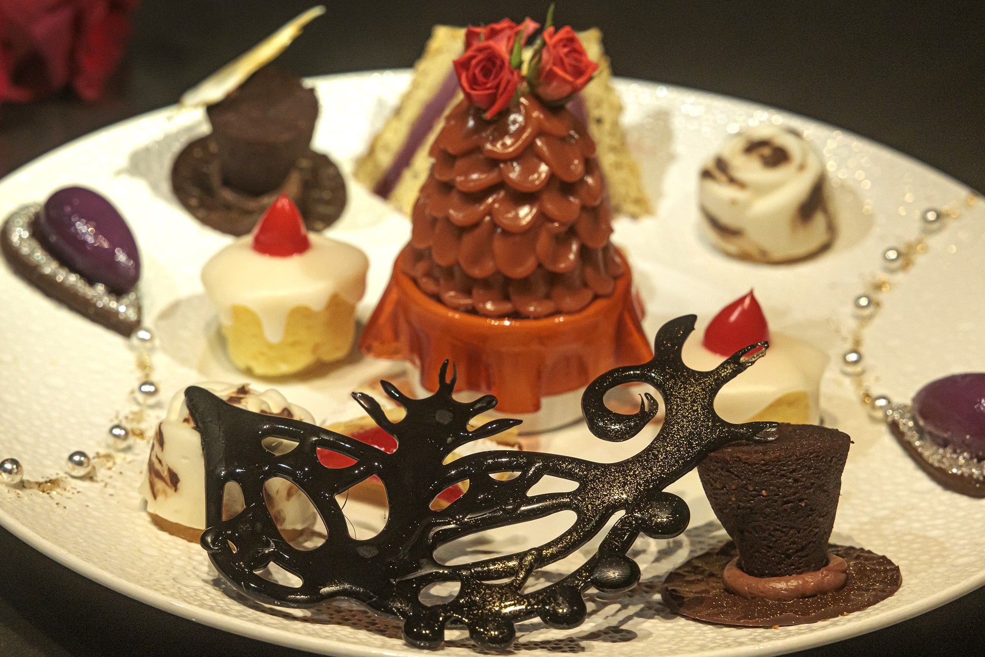 中世ヨーロッパの宮廷社会が起源とされる仮面舞踏会。豪華な衣装で着飾り“仮面”を着けながら華やかに交流する妖艶な舞踏会の様子をプレートに表現しました。デザインの美しさから想像する味わいとの違いから仮面の奥に秘めた“Masquerade”ならではの遊び心もお楽しみいただけるアフタヌーンティーです。