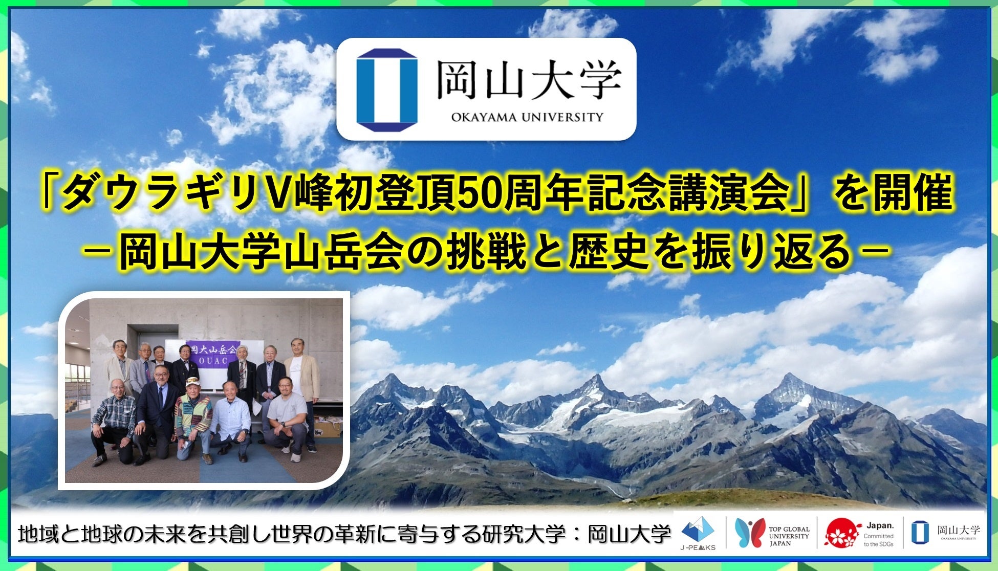 国立大学法人岡山大学(本部:岡山市北区、学長:那須保友)は、2025年5月25日、本学津島キャンパスの岡山大学創立五十周年記念館において、「ダウラギリV峰初登頂50周年記念講演会」を開催しました。
