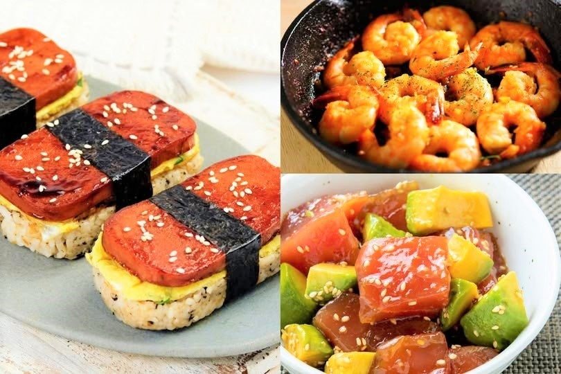 プールサイドには、約20種類の異国情緒あふれるグルメがずらり。マグロとアボカド、小海老とマンゴーなど全3種の「ポキ」や、にんにくの香りが上品に立ち上る「ガーリックシュリンプ」、さらに肉厚なスパムを使用した「スパムおにぎり」など、ハワイの定番グルメをご用意しました。