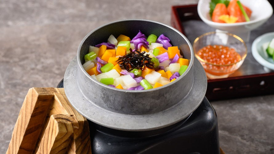 プリンスホテルの和食調理人として25年間培ってきた日本料理の経験と技術を基に、北海道食材の魅力を生かした料理の数々をご用意いたしました。先付け「北海道産毛蟹と帆立貝 菊花浸し」に始まり、前菜5種の一品「富良野産さくら玉子と北海道産雲丹」、吸い物「北海道産喜知次道明寺揚げ あおさ風味」、煮物「羅臼産銀鱈味噌煮」、食事「富良野産ゆめぴりか釜炊き 彩り野菜のせ」など、全10品からなる特別会席料理です。ホテル最上階の眺望と落ち着きある空間で、日本酒のソムリエ「SAKEディプロマ」が厳選した日本酒とのマリアージュを存分にご堪能いただけます。