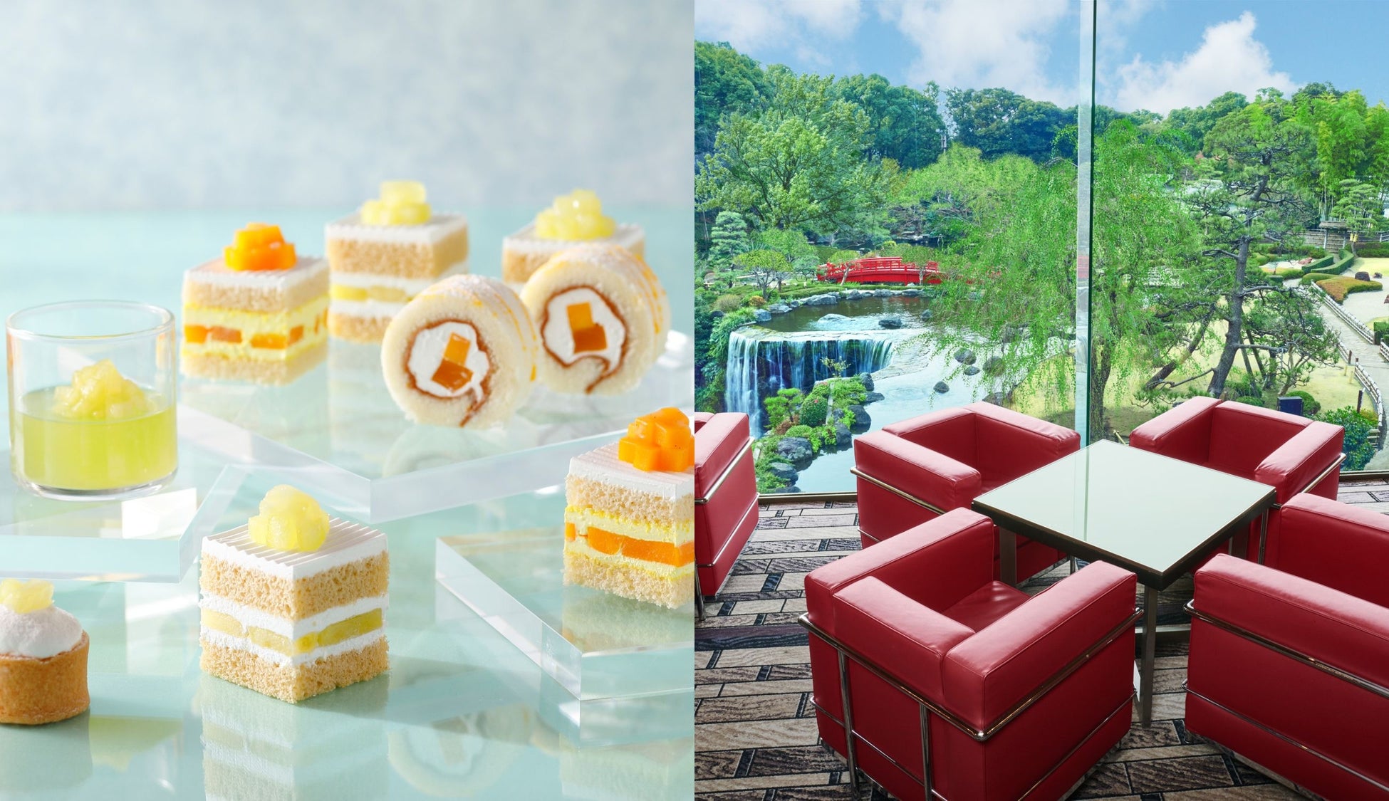 約1万坪の日本庭園を目の前に望む絶景ティーラウンジ「ガーデンラウンジ」で、毎シーズン人気の『スーパースイーツビュッフェ2025』。5月・6月は旬の「メロン&マンゴー」をテーマに展開中です。