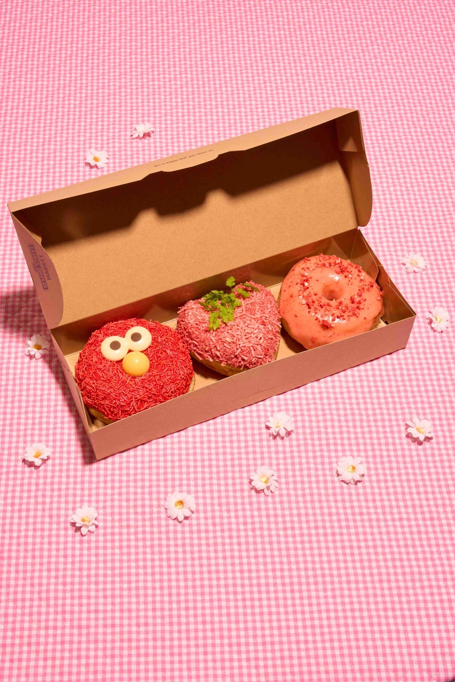 いちごのチョコレートドーナツ、いちごのドーナツ、エルモドーナツの3種類がセットになったドーナツBOX。