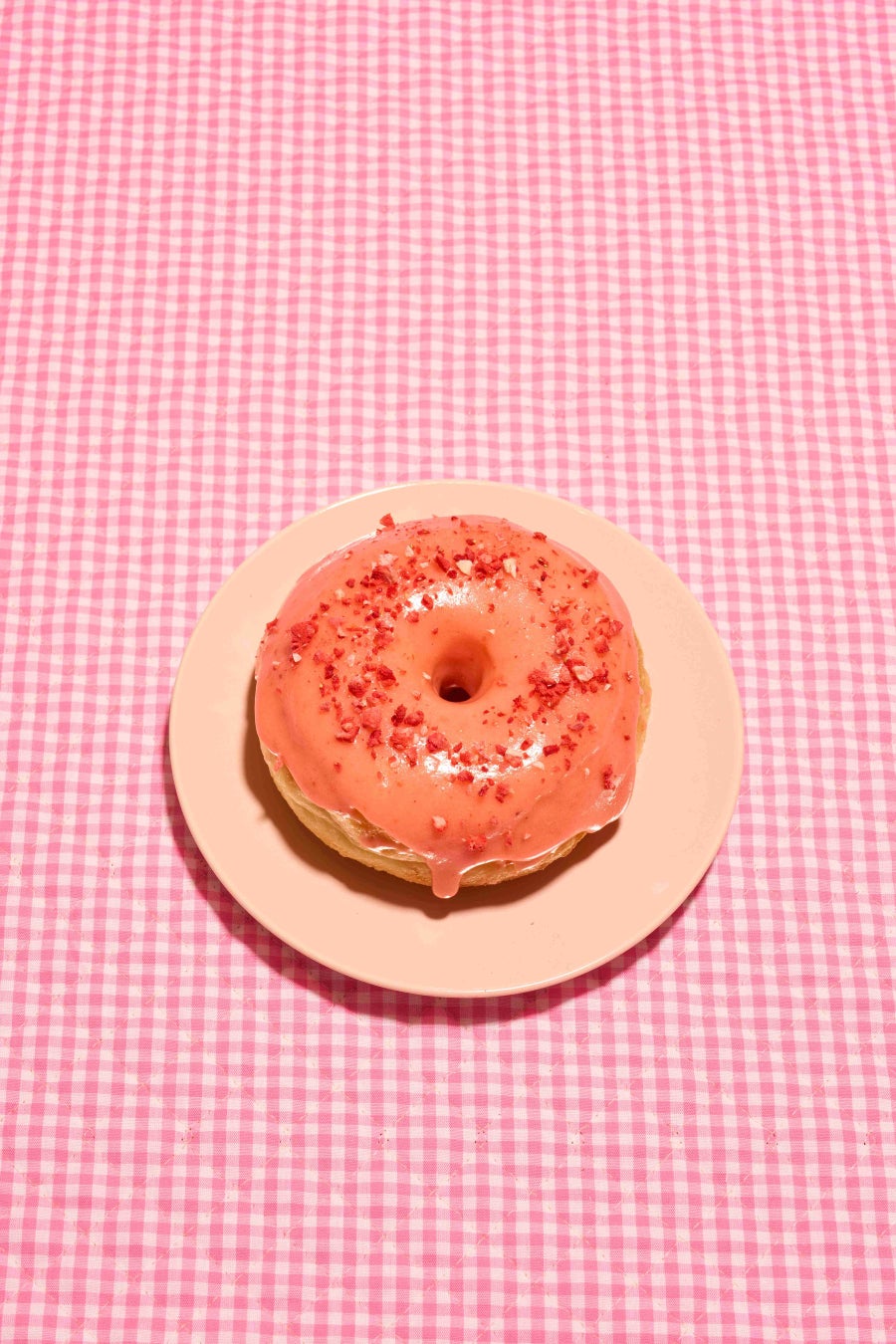ふわふわのドーナツ生地にいちごチョコを纏わせ、トッピングにいちごパウダーとココナッツをふんだんに使用しました。