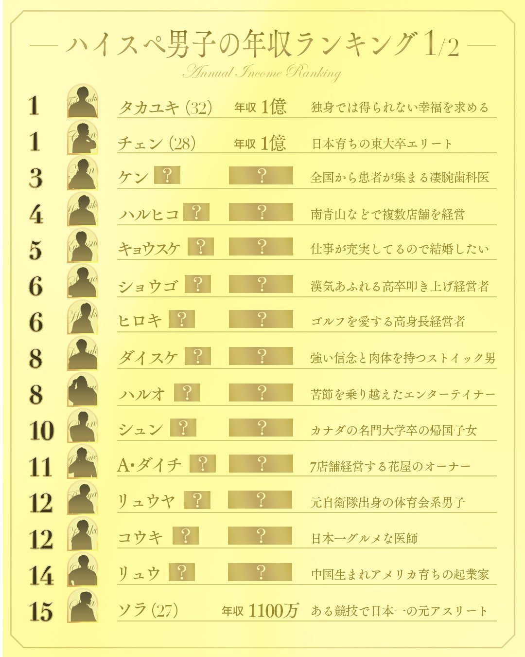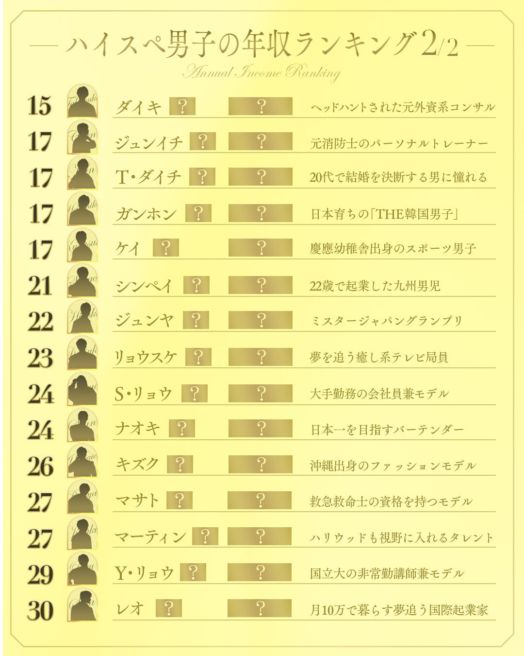 今回公開したランキングは、本プログラムに参加する厳選された”ハイスぺ男性”総勢30人を、年収順に一覧化したものです。平均年収は2,000万円超、平均年齢は30.6歳という超ハイスペックな30人が集結。中には、年収1億円の経営者や東大卒エリート、グローバル起業家、その他にも医師やミスタージャパングランプリなど、個性豊かなメンバーが集っています。