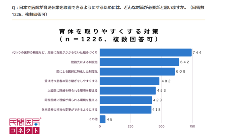 今回のアンケートでは、育休を取得できるようにするための対策として、代わりの医師の補充など、周囲に負担がかからない仕組みづくりが必要と考える医師が多数いることがわかりました。具体的には、「外来の代診や当直担当の医師を臨時で雇う」「カバーする医師の給料アップ」といった意見が寄せられました。また、なかなか進まない男性医師の育休取得を進めるには、上級医や同僚、患者など周囲の理解が重要であることがうかがえました。