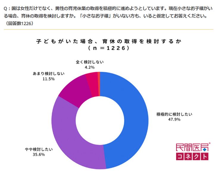 子どもの有無にかかわらず、すべての医師に現在、小さな子どもがいる場合(もしくは、いると仮定した場合)、育休の取得を検討するかどうか尋ねました。その結果、「積極的に検討したい」(47.9%)と「やや検討したい」(35.6%)を合わせると83.5%(1,024人)で、大多数が育休の取得を検討したいと考えていることがわかりました。一方、「あまり検討しない」(11.5%)と「全く検討しない」(4.2%)を合わせると、15.7%(192人)でした。