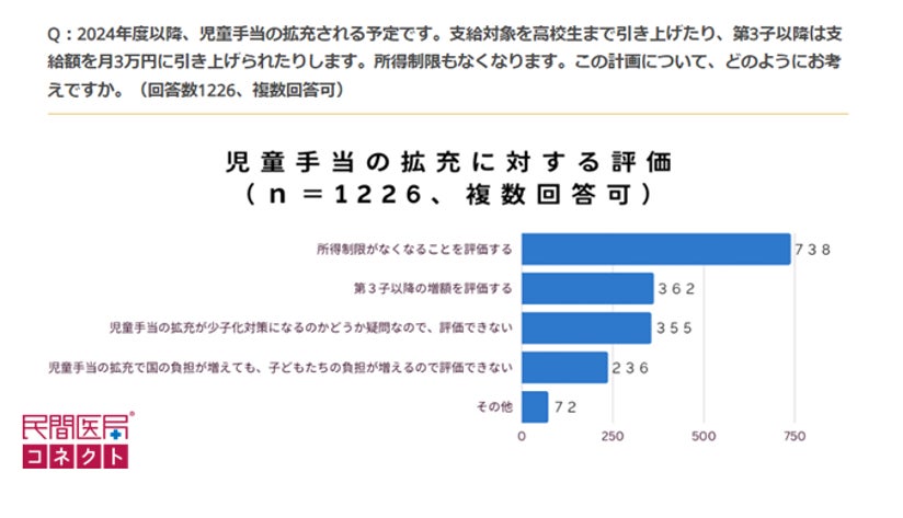 2024年度以降、児童手当は、高校生年代まで支給期間を延長し、多子世帯への増額(第3子以降3万円)、所得制限の撤廃など拡充が予定されています。一方で、支給対象を拡充する場合には、扶養控除の見直しも検討されています。この計画への考えについて聞きました(複数回答可)。多くの支持を集めたのは、児童手当の受給資格で「所得制限がなくなることを評価する」で60.2%(738人)、続いて「第3子以降の増額を評価する」が29.5%(362人)と、好意的にとらえているという回答が上位を占めました。一方で、「児童手当の拡充が少子化対策になるのかどうか疑問なので、評価できない」が29.0%(355人)、「児童手当の拡充で国の負担が増えても、子どもたちの負担が増えるので評価できない」が19.2%(236人)と、評価できないという意見も一定数ありました。