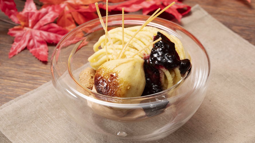 トンカ豆で香り付けした栗のアイス、焼き目を付けたスイートマロン、チョコレートクリーム、モンブランクリーム、サクサクのクランブル、余市産ハスカップのソース、栗のいがに見立てた揚げそうめん、で組み立てた、いろんな食感と風味が楽しめるミニパフェ