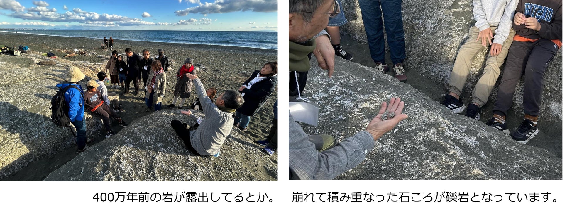 講座の会場として選んだ海岸は砂浜です。ただこの場所(海岸)にはめずらしく岩が露出しています。ペットの犬と散歩をする住民もたくさんいて、毎日のようにこの砂から顔を出す岩の上を歩いています。案外知られていないのは400万年くらい昔、東日本が隆起して島から陸地になったころの岩盤がここに露出しているらしいということなのです。地層が横倒しになっていたり、泥が固まってできた泥岩、細かいさまざまな石粒が混じった礫岩などが50cmから1mの間隔で積み重なっていて大きく地層が動いていた形跡がわかります。台風の大波が海岸の砂を沖合に移動させると横幅数百メートルの磯が出現するのもこの場所の面白いところです。磯が大きく露出した報道があると化石採取を楽しみにしている人たちがあちこちからやってきます。普段砂の下で掘ることのできない岩が現れるからです。