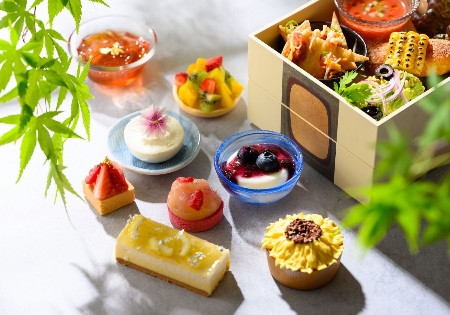 夏の代表花ひまわりをモチーフにした「花のカップケーキ」、カラフルなカットフルーツでトッピングした「フルーツサラダ」、能登のブルーベリーを使用した「パンナコッタ能登ブルーベリーソースがけ」など、夏の涼しげなスイーツを一度に楽しめるメニューです。旬の夏野菜をたっぷり使った「ベジタコミートとナチョス」や「魚介とガスパチョのカクテル」などの軽食とともにお召し上がりください。