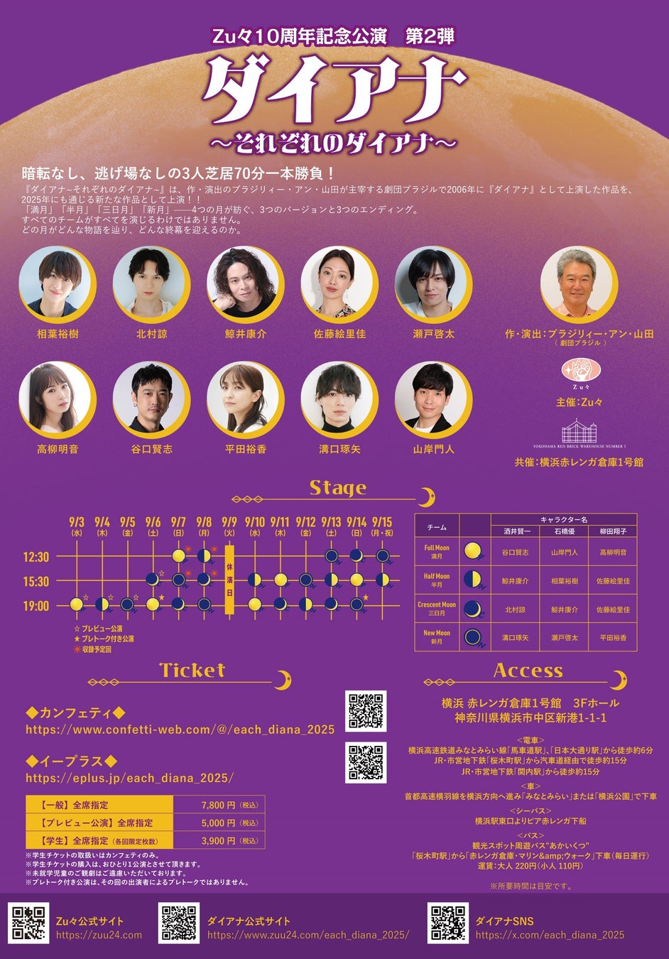 Zu々 プロデュース10周年記念公演 第2弾『ダイアナ~それぞれのダイアナ~』が2025年9月3日 (水) 〜 2025年9月15日 (月・祝)に横浜赤レンガ倉庫1号館3Fホール(神奈川県横浜市中区新港 1丁目1番1号)にて上演されます。