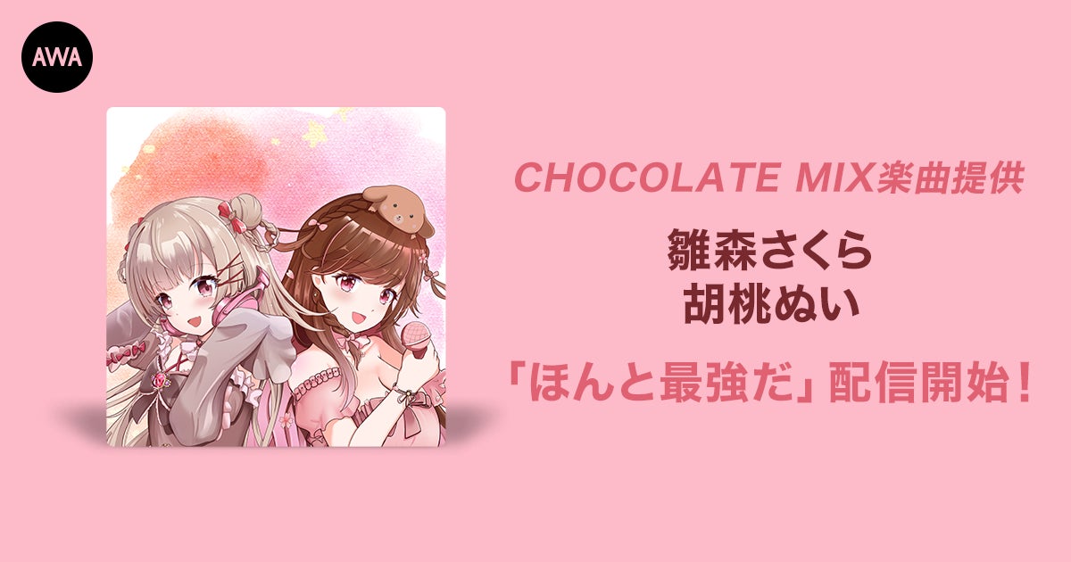 AWA株式会社(本社:東京都港区、代表取締役CEO:冨樫晃己)が運営する、サブスクリプション型(定額制)音楽ストリーミングサービス「AWA(アワ)」は、IZ*ONE、乃木坂46、櫻坂46など有名アイドルグループへ多数楽曲提供している CHOCOLATE MIXの楽曲提供オーディションを開催。この度、入賞者の雛森さくら ・ 胡桃ぬいが歌う「ほんと最強だ」がリリースされました。是非、注目の音楽プロデューサーCHOCOLATE MIXと新進気鋭の歌い手のコラボレーションをお聴きください。