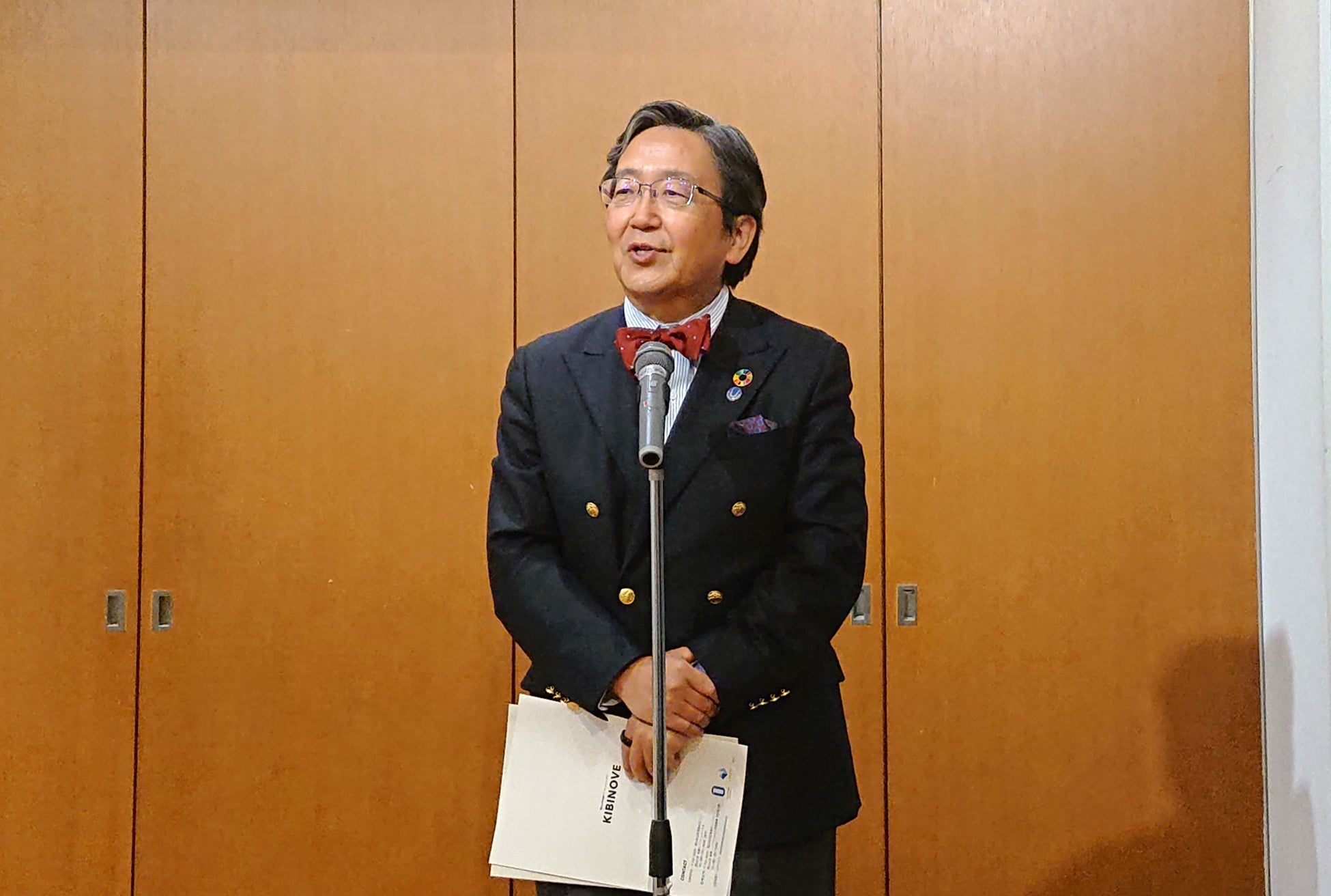 本会は、幹事役を務める長谷川伸城氏(法学部卒)の司会により進行。那須学長からは日頃の本学への支援の御礼とともに、学生の活躍として教育学部3年の石本龍一朗さんが「2025年東京デフリンピック」の日本代表に内定したこと、研究ファーストの研究大学としての大学改革の一環として、人事基本方針の公表や文部科学省「地域中核・特色ある研究大学の連携による産学官連携・共同研究の施設整備事業」の支援を受けて建設し、「地域中核・特色ある研究大学強化促進事業(J-PEAKS)」の支援により整備した新たな施設である共創イノベーションラボ(KIBINOVE, きびのべ)などについて紹介しました。