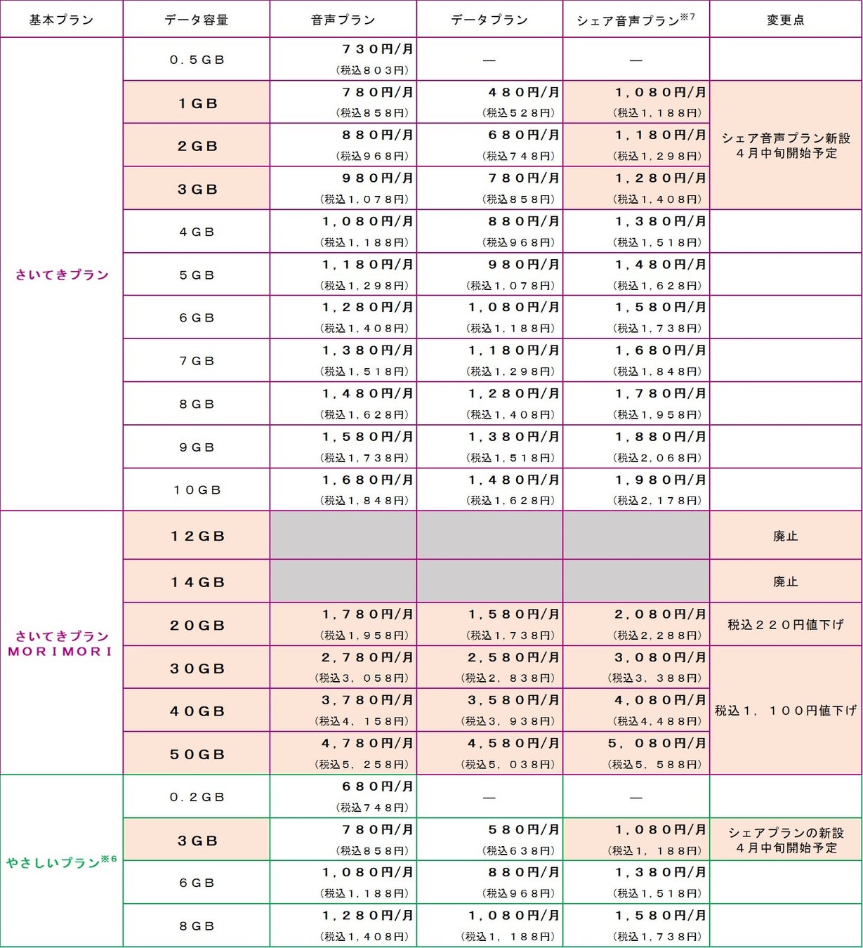20GBプランの値下げにより、変更前の12GBプランと同額になるため、12GBと14GBを廃止します。4月1日より、現在12GBをご利用のお客さまは、利用料金はそのままで容量が20GBへ変更となり、14GBは利用金を税込110円値下げ、容量は20GBへ変更となります。今回の料金値下げ及び料金プランの廃止により、1GB※3)~10GBまでは1GB税込110円刻み、20GB~50GBは10GB税込1,100円刻みと分かりやすくなります。