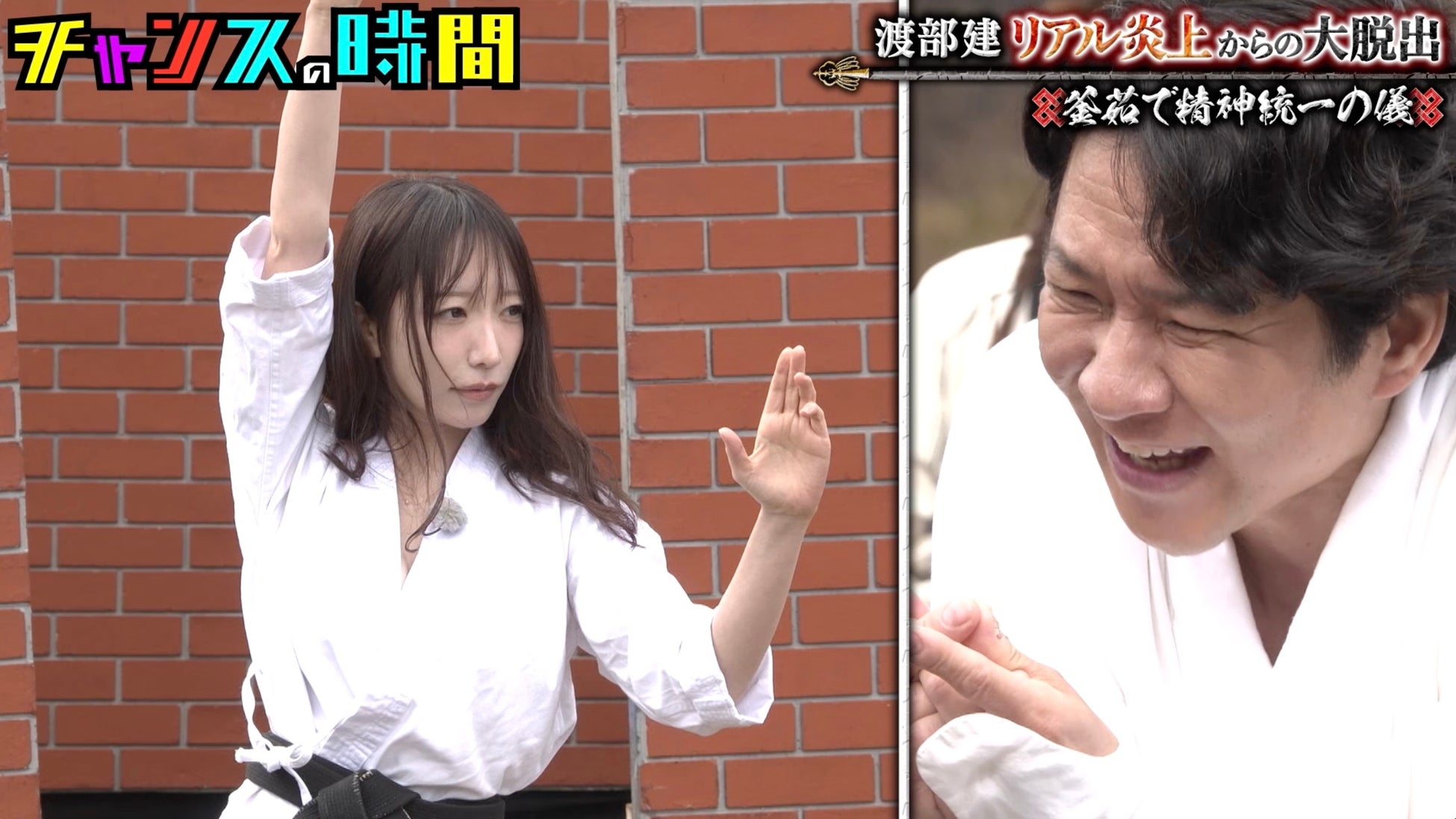 制限時間内に小屋から脱出できなければ、渡部もろとも小屋が大爆破されるという過酷なミッションが待ち受ける中、まずは渡部がやっておくべき儀式として「釜茹で精神統一の儀」を実施。燃え盛る炎の上に載せられた釜に浸かり、精神統一を図る渡部の前で、無事を祈願するゲストたちの“演武”が披露されます。グラビアタレントの清水あいりによる“セクシー空手”や、オダウエダ・植田紫帆による過激な水着姿での“バランスボール芸”、きしたかのによる傘回し、そして白桃ピーチよぴぴによる長すぎる自作小噺とオリジナルソングなど、次々と展開されるカオスな演武に、渡部は熱さに耐えきれず何度も釜から飛び出してしまう事態となりました。