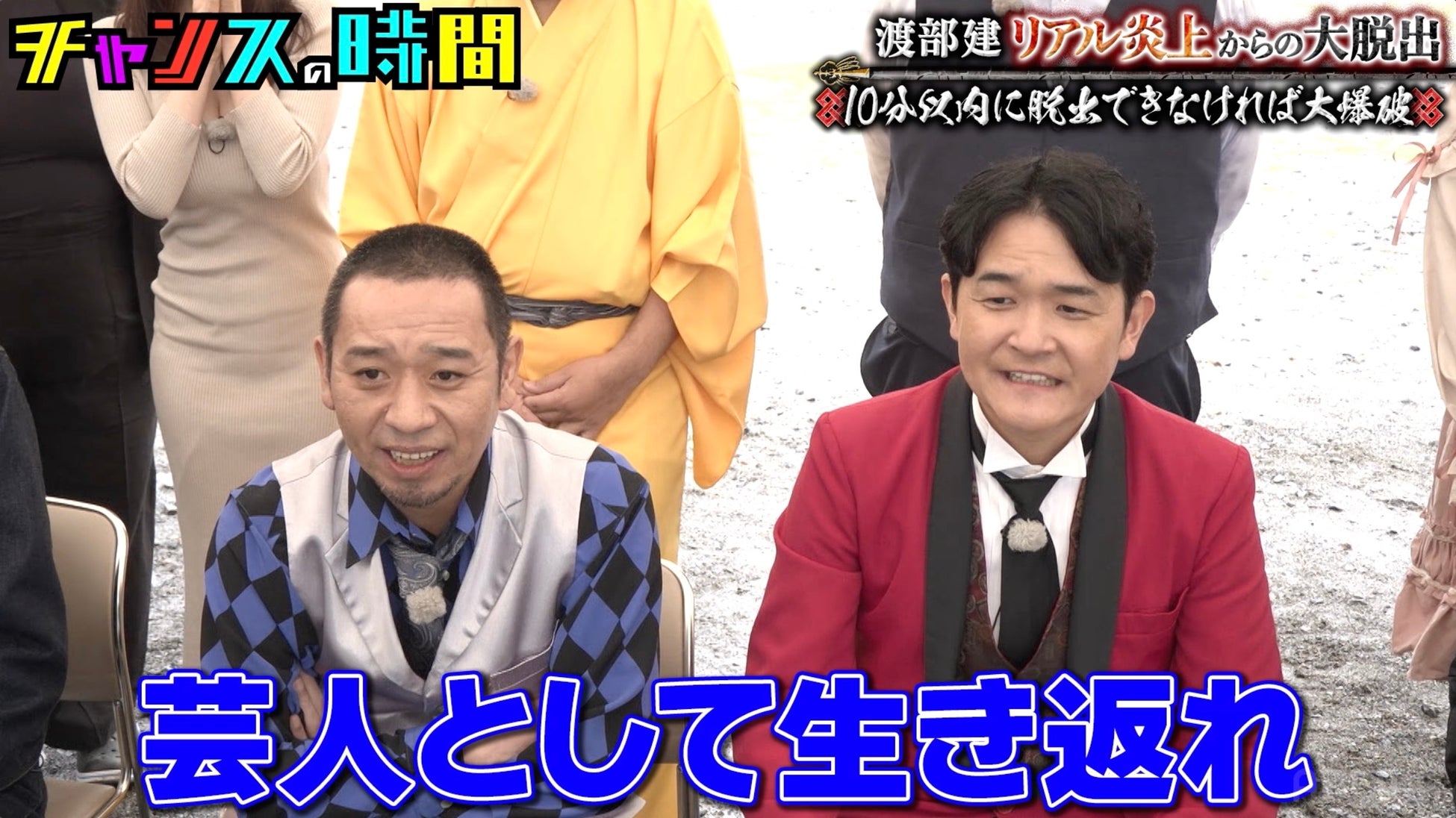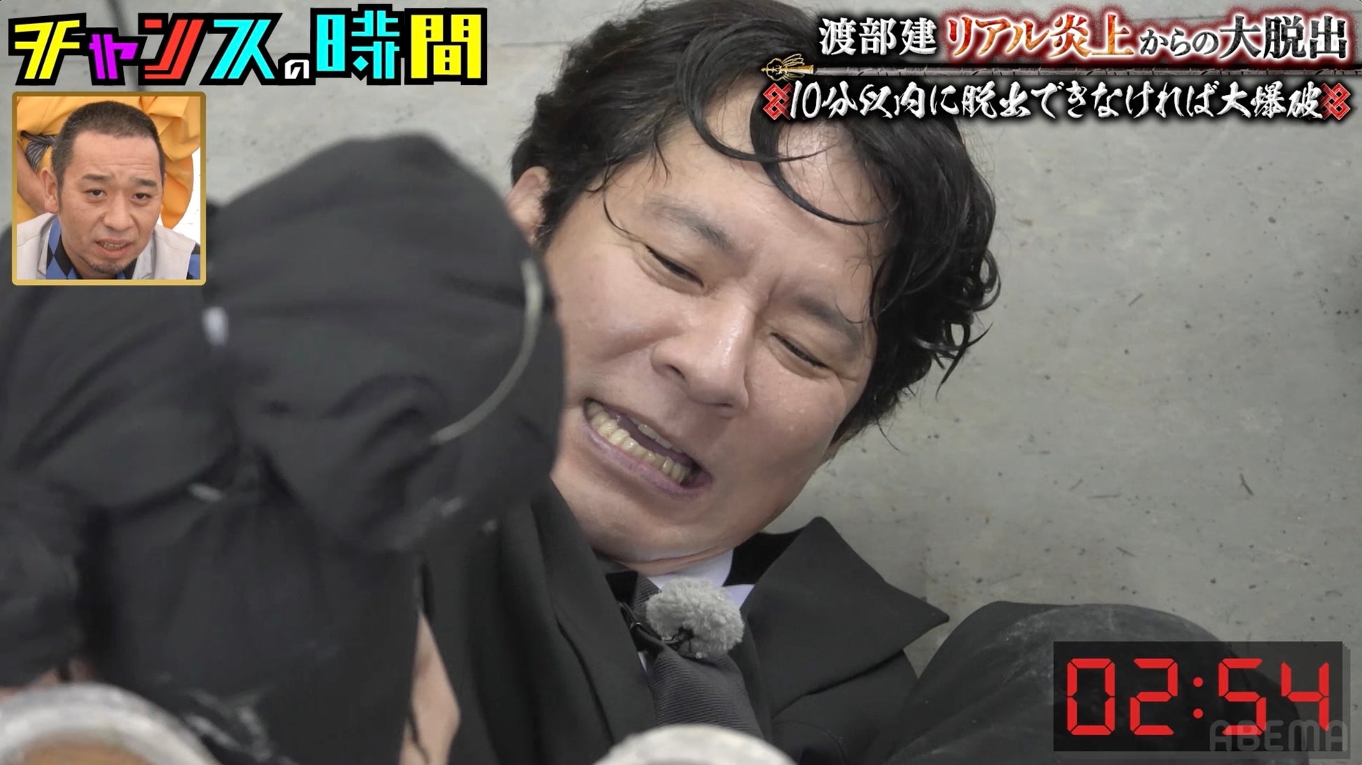 全ての儀式を終え、いよいよ大爆破まで制限時間10分と迫る中、ついに「リアル炎上からの大脱出」がスタート。謝罪会見と同じ黒いスーツに身を包んだ渡部は、目隠し状態で小屋へと監禁されます。後ろ手に手錠をかけられた渡部は、水槽の鍵を口で取るミッションに挑むも、フェイスシールドが邪魔になり大苦戦。さらに縛られた足でジャンプして天井の鍵を奪取するなど、極限状態での脱出劇が展開されます。刻々と時間が迫る中、ハンマーで壁を突き破ろうとする渡部に、大悟から「芸人として生き返れ」と熱い声援が。しかし残り1分を切ったところで、大悟が「誤作動で1つ爆発してしまいました!」と叫ぶ絶体絶命の事態が発生…。果たして、渡部は大爆破の前に生還できたのか!?緊迫の結末は、ぜひ本編にてご覧ください。本放送は、放送後7日間、無料で見逃し視聴が可能です。