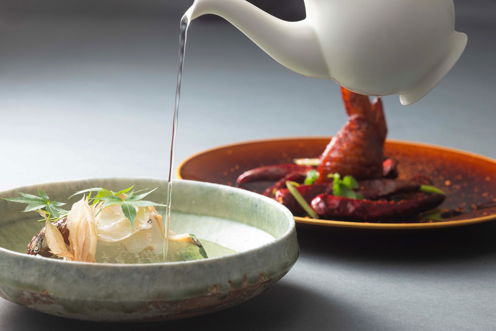 旬の鮑は、江戸時代、小諸城主にも献上されたという古文書をもとに、美食家・北大路魯山人が好んだとされる「鮑の水貝」に仕立てました。信州の天然水に浮かぶ鮑の刺身を山椒ソースで堪能いただく、信州の夏の涼を感じる一品です。身の引き締まった繊細な鮑の歯ごたえをお楽しみいただけるよう、お客さまの目の前で塩水を注ぎご提供いたします。