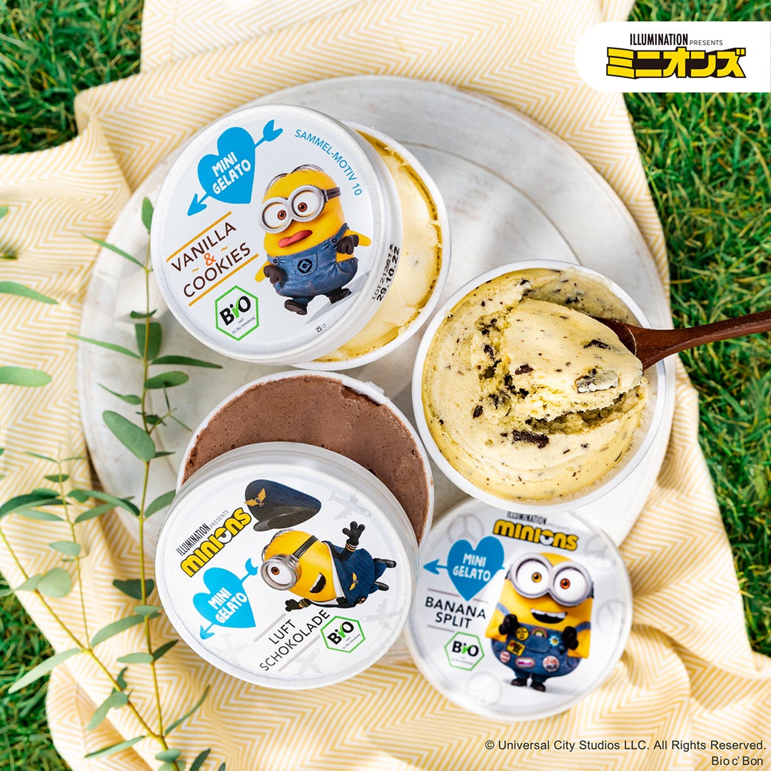 愛嬌のある表情と動きが世界中で人気のミニオンが描かれた楽しいカップのデザインに加え、ヨーロッパでオーガニック認証を受けたアイスは、ミニオンが大好きなバナナの味など3種類がそれぞれ違った味わいを楽しめます。