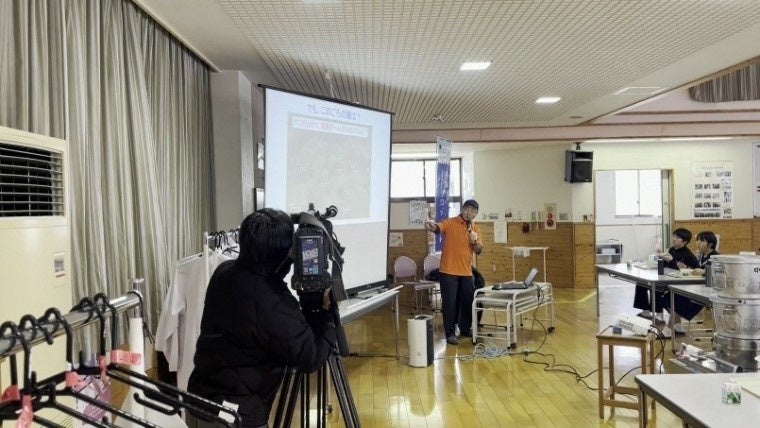 今、鳥取の海ではムラサキウニが大量に発生し、海藻を食い荒らすという問題が起きています。海藻が生い茂る場所「藻場(もば)」は魚のすみかであり、二酸化炭素の吸収源でもある、海にとって大切な存在です。青谷小学校では地元の海の問題などについての動画放映を行い(左下写真)、児童らは声をあげながら熱心に海の実際の状況について見入っていました。一方、青谷中学校では古田事務局長による本日のメニューの背景や藻場の関わりなど紹介がありました(右下写真)。古田事務局長による藻場の話は約20分と限られた時間の中で、青谷の海の状況や漁業者の取り組み等丁寧に説明が行われました。
