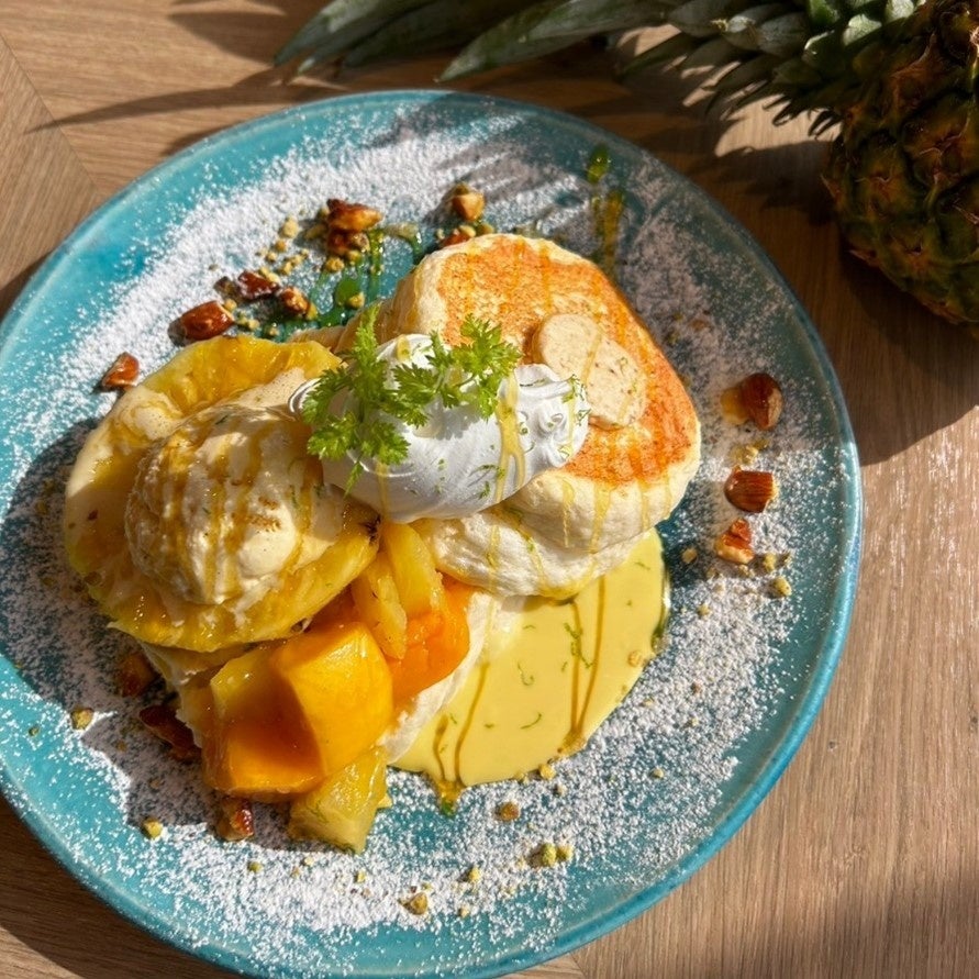 旬のフレッシュパイナップルは、甘く爽やかなシトラスカスタードと共にふわしゅわな自慢のパンケーキを引き立てます。添えてあるバニラアイスは贅沢気分をプラス。