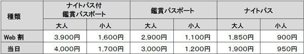 上記ナイトパスまたはナイトパス付鑑賞パスポートのとおり