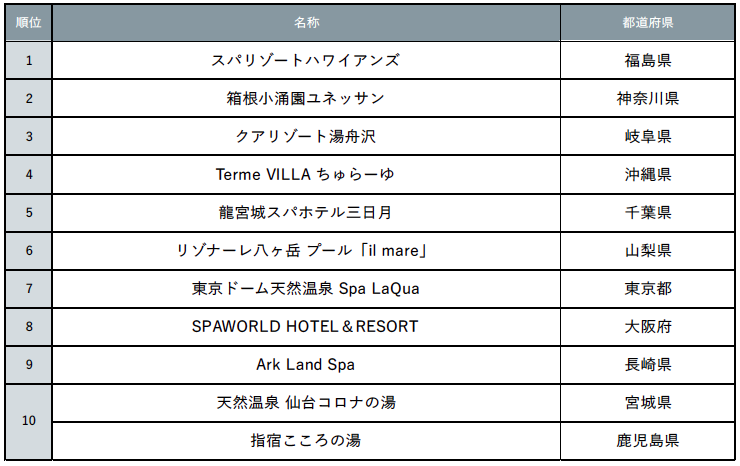 寒さが一段と厳しくなるこの季節、心も体もほっと温まる温泉やスパが恋しくなる頃ではないでしょうか。今回は、温泉とプールが両方あったり、岩盤浴やさまざまなお風呂が楽しめたりする館内施設充実の“一日遊べる温泉テーマパーク”についてアンケート調査を実施しました。第1位に選ばれたのは、福島県「スパリゾートハワイアンズ」。6つのテーマパークを備えた全天候型のエンターテインメント施設で、年中常夏!いつでもハワイ気分を味わえます。第2位には、神奈川県「箱根小涌園ユネッサン」がランクイン。箱根の温泉を気軽に楽しめる温泉アミューズメントパークで、ユニークなお風呂や一年中遊べるプールも魅力です。そのほか、旅行情報サイト『じゃらんニュース』では、TOP10以外にもおすすめの温泉テーマパークを厳選して紹介しています。(温泉テーマパーク:https://www.jalan.net/news/article/180729/)