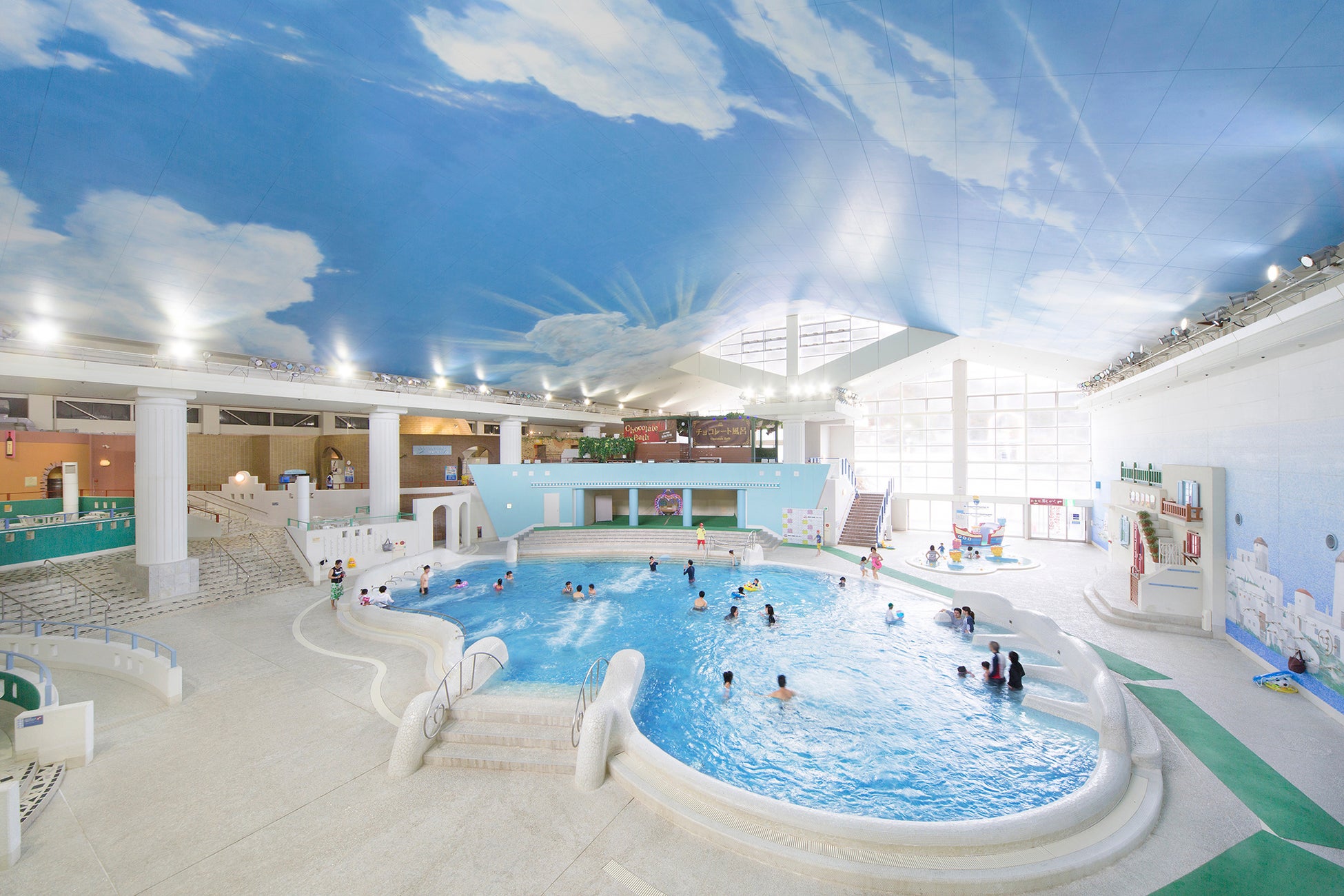 3つのゾーンからなる一日過ごせる施設。「天然温泉ゾーン」では、とろみのある肌触りのよい100%天然温泉につかり、露天風呂やサウナでゆったりできます。「プールゾーン」には全長60m超のウォータースライダー付き屋内温水プールや、夏季限定の屋外流水プールを完備。「バーデゾーン」では、水着で入れるスパエリアに13種類の浴槽があり、ジェット水流や気泡で体をほぐしながら、寝そべる・座る・歩くなどのスタイルで楽しめます。