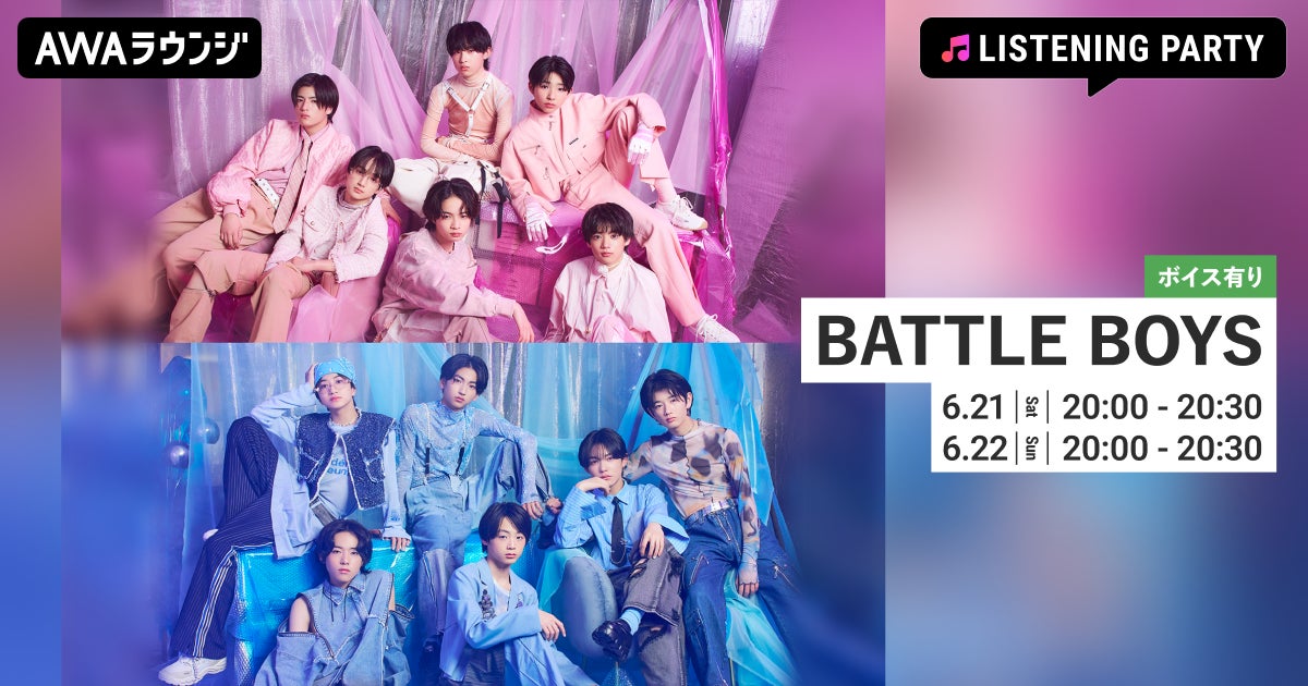 AWA株式会社(本社:東京都港区、代表取締役CEO:冨樫晃己)が運営する、サブスクリプション型(定額制)音楽ストリーミングサービス「AWA(アワ)」は、2025年6月21日(土) 20:00~20:30、2025年6月22日(日)20:00~20:30の2日間に渡り、無料で誰でも参加できるオンライン空間「ラウンジ」で、BATTLE BOYS特集のオンラインイベントを開催いたします。