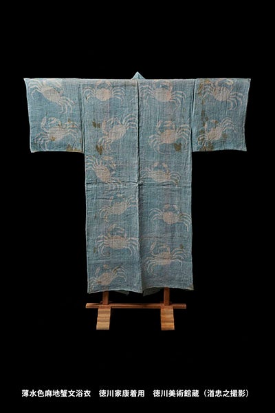 徳川家康が着用していたと伝えられる浴衣は33領現存しており、「薄水色麻地蟹文浴衣」はそのうちの1領となっています。カニ部分に防染糊を型置きし、藍で引き染めした後水洗いして糊を落とし、模様部分を白抜きにする白防染(白揚がり)という技法で染められました。生地は苧麻(※高級麻織物の原料)を用いた上布(※上等の麻布)でつくられています。
