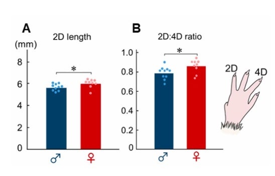 (A)第 2指長(2D)の性差。オスはメスと比較して第2指が第4指に比べて短いことが示されました。