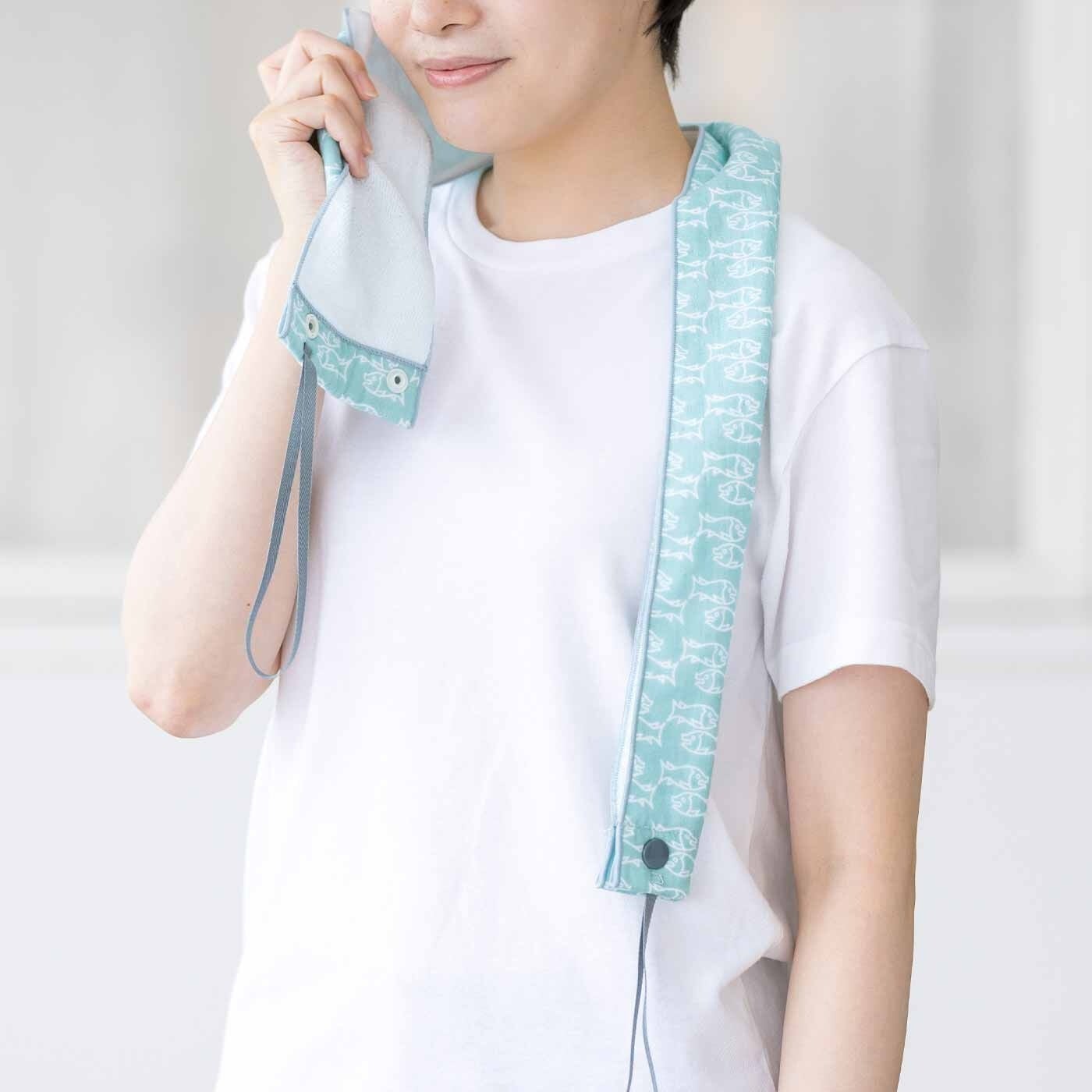 タオルの長さは約100cmのロングサイズで、首からかけた状態でも汗を拭きやすい長さです。