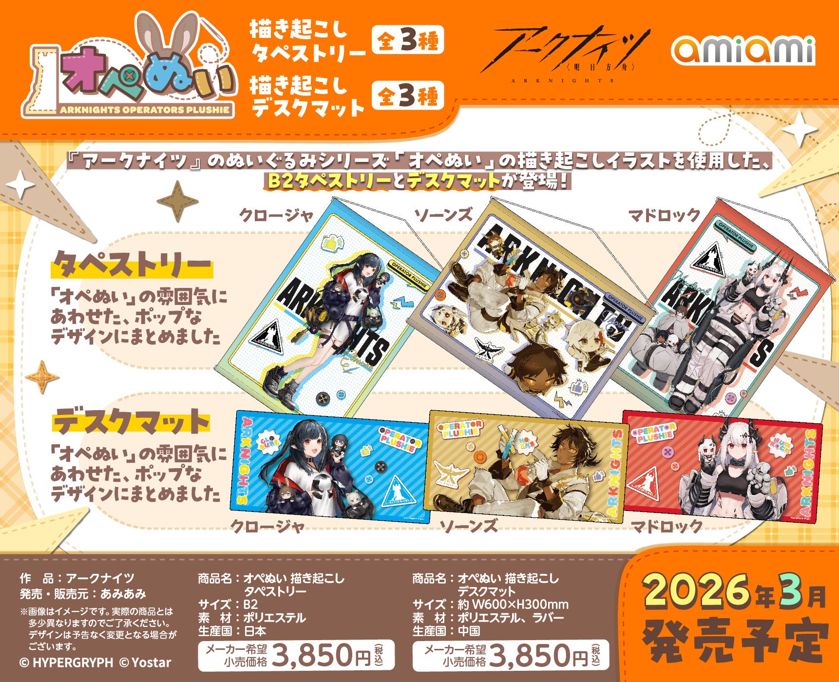 フィギュア&ホビー通販大手の「あみあみ」を運営する大網株式会社(本社・東京都文京区)は、『アークナイツ』のぬいぐるみシリーズ「オペぬい」の描き起こしイラストを使用したグッズ全10商品を、現在ご案内中です。