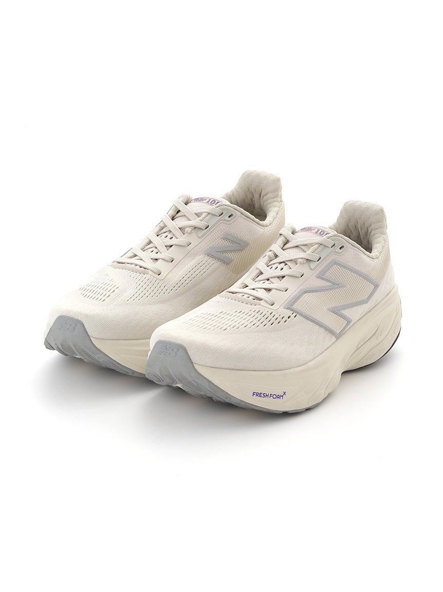 衝撃吸収性に優れたFresh Foam Xミッドソールと、アップデートされたサイドウォールとアウトソール構造で、普段使いからランニングまで幅広いシーンで活躍するモデルです。軽やかな履き心地を表現するようなべージュのグラデーションに、Nロゴのシルバーやシュータンやインソールに入った深いパープルがアーバンな印象をプラス。アッパーにリサイクル糸を使用、フットベッドは100%リサイクル素材を使用したサステナブルモデルです。