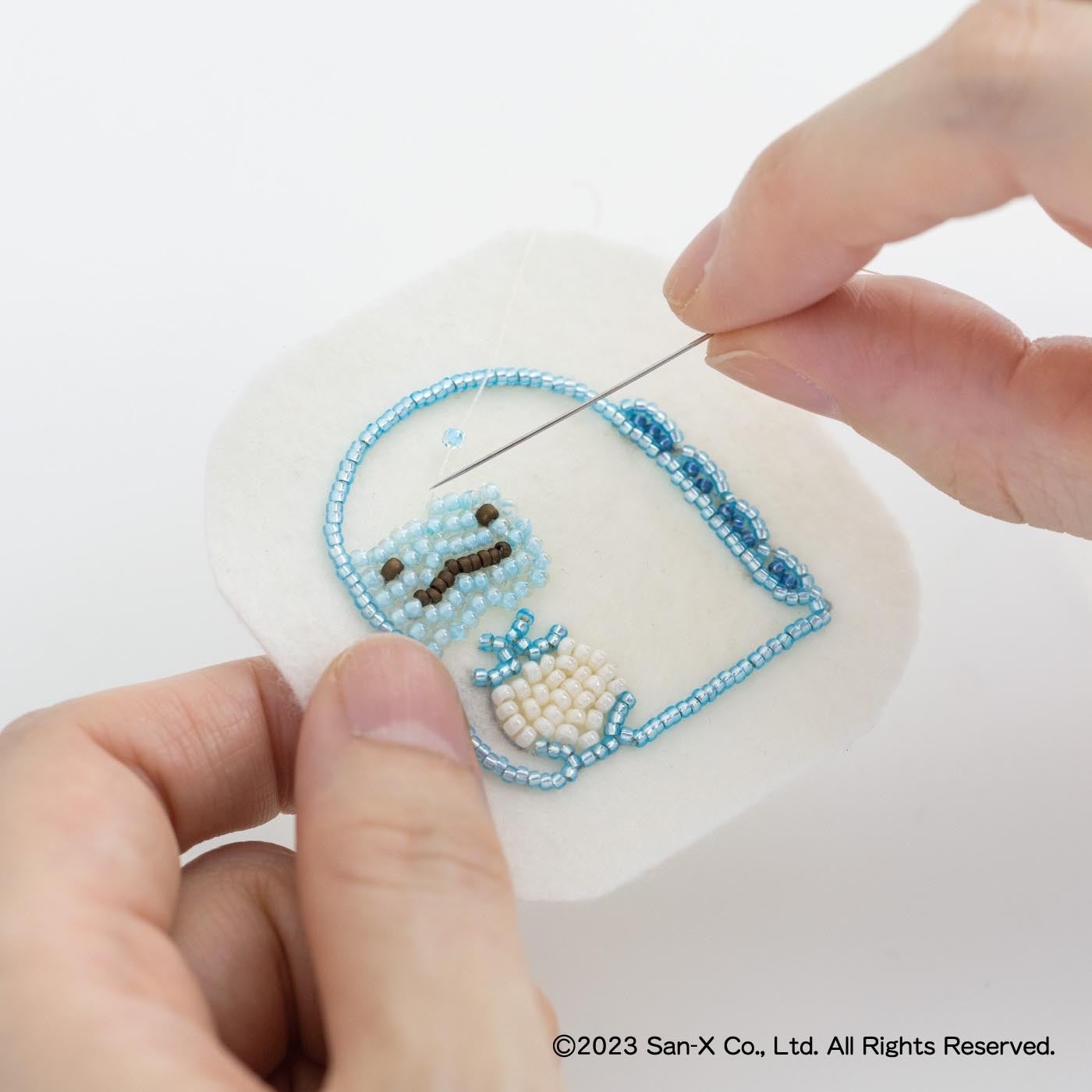 図案を印刷したフェルトにビーズを刺しゅうして、きらりと光るブローチを作れるキットです。最初に図案のアウトラインを刺したら、あとはぬり絵を楽しむように、内側をちくちく刺し埋めていきます。埋め終わると、すみっコぐらしのブローチが完成します。