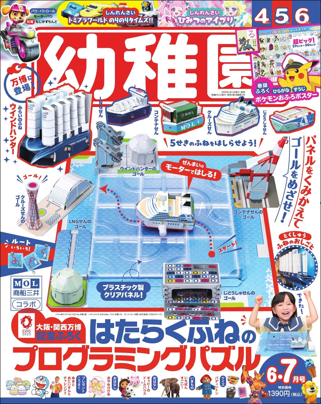 さらに『幼稚園』誌面でも大型船を大特集。さまざまな船の役割や船で働く人を紹介するとともに、今回の付録〝未来の船 ウインドハンター〟が展示されている大阪・関西万博2025の「未来の都市」パビリオンを取材。商船三井が開発を進める、自動運転で風の流れを読み取り、水素を作りながら帰ってくる、地球に優しい “未来の船” を紹介します。