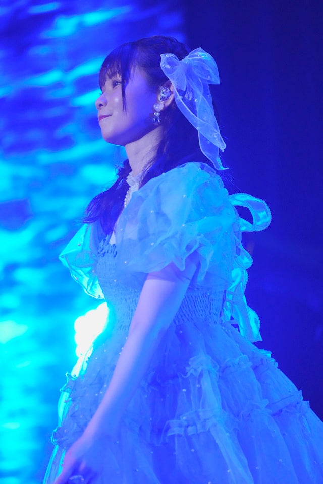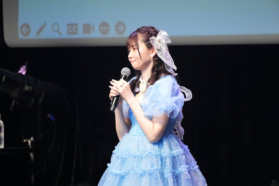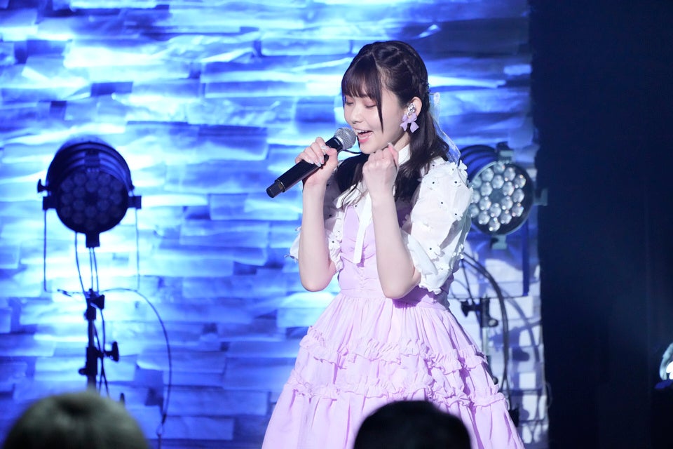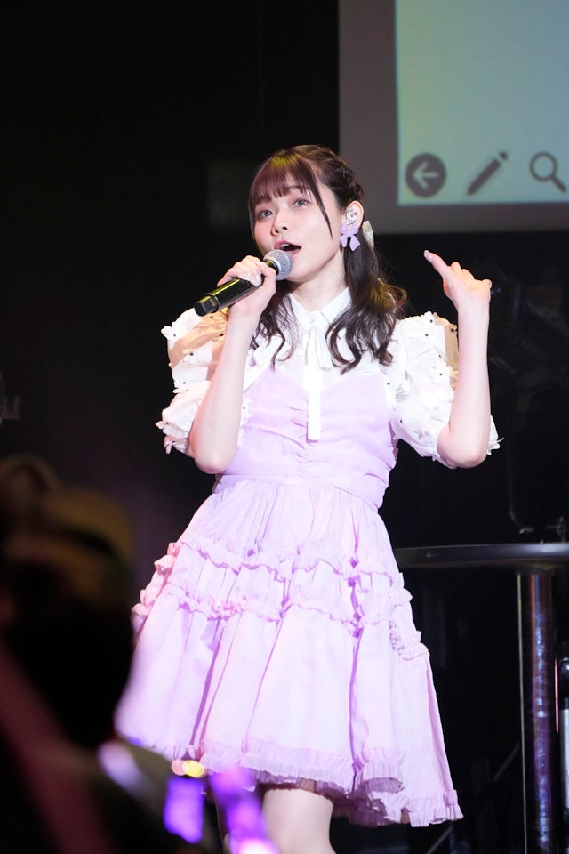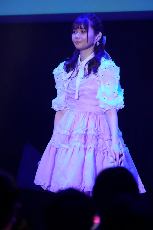 イベントの最後を締めくくったのは、諏訪のソロライブパート。昼公演ではライトブルー、夜公演ではパステルパープルと、2色それぞれのドレスワンピに身を包み、各部とも3曲を披露する。歌唱したのは、軽やかさとキュートさが流れ星が加速するように増幅していく「Starry Garden」と、リズムの切れ目となる部分に流れるように歌詞を挿入するなど、こちらはまた違った種類の“駆け抜け方”をする「あたしびより」。どちらも今回のイベントが初披露の機会となった。