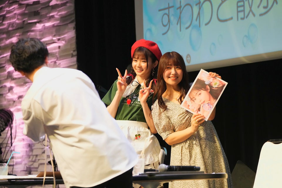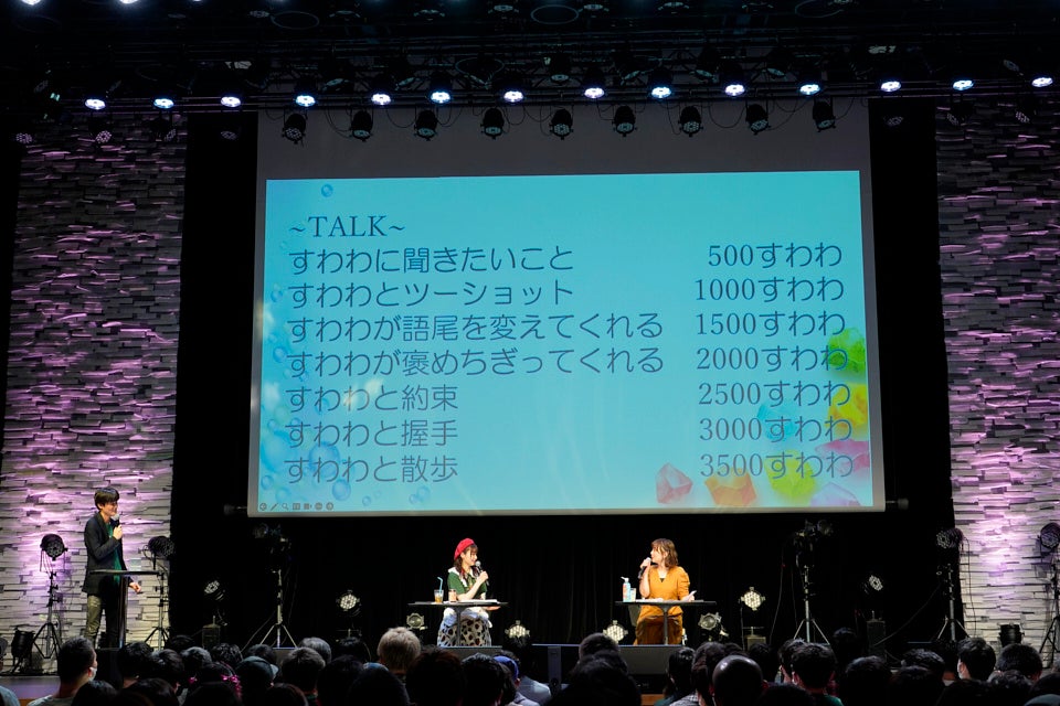 実際、通貨=すわわの使い方が説明された段階で、miccoがすぐさま2000すわわを消費して、自前のスマートフォンでツーショットを撮影すると、今度は諏訪の語尾を「〜すわ?」に変えるようにお願い。そのなかで、あくまでも語尾が正しく使えるのかを確認すべく、「すわわに聞きたいこと」に抵触しないよう、普段はどんなパジャマを着ているのかを尋ね、「パジャマは〜、ぬいぐるみ柄のパジャマを着てるすわ〜」というファン垂涎だったに違いない情報を引き出してくれたのだが、ふと横を見ると菊池が不貞腐れている。「miccoしかいい想いをしていない」と、彼女のどこ吹く風な一連の行動にぼやきがこぼれている。