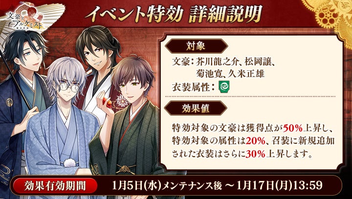 期間中「芥川龍之介」「松岡譲」「菊池寛」「久米正雄」の衣装を編成して潜書すると、得点の獲得数がそれぞれ50%上昇します。また、「風」属性の衣装を編成して潜書すると、得点の獲得数がそれぞれ20%上昇します。