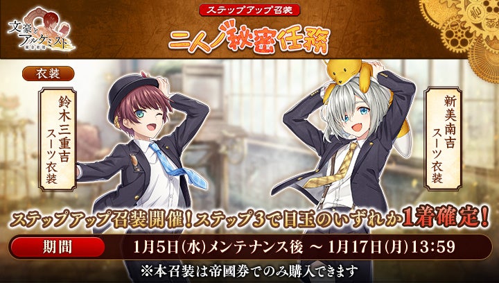 文豪の「衣装」や、会派に装備する事で能力を強化できる「装像」などが入手できるコンテンツ「召装」に、限定召装「二人ノ秘密任務」が期間限定で登場します。この召装では新しく追加された鈴木三重吉と新美南吉の〈スーツ衣装〉を獲得できます。