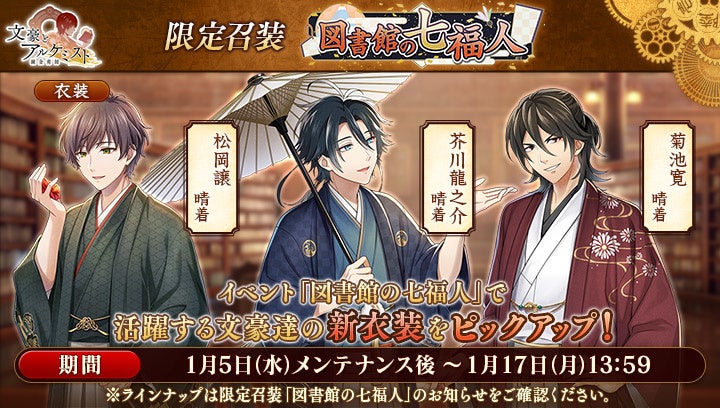文豪の「衣装」や、会派に装備する事で能力を強化できる「装像」などが入手できるコンテンツ「召装」に、限定召装「図書館の七福人」が期間限定で登場します。この召装では、イベント『調査任務「図書館の七福人」』で活躍する「松岡譲」「芥川龍之介」「菊池寛」の新衣装を一定の確率で入手できます。
